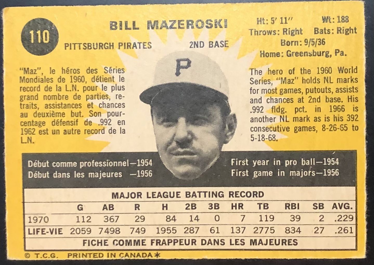 Card #110 MLB, baseball, vintage, OPC, hall of fame