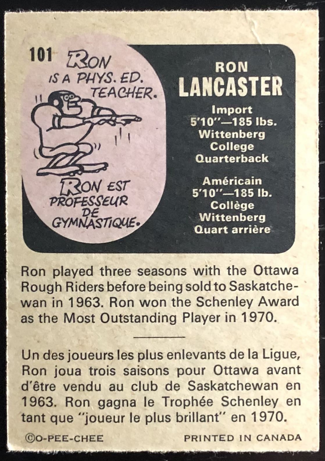 Card #101 CFL, football, vintage, hall of fame, OPC
