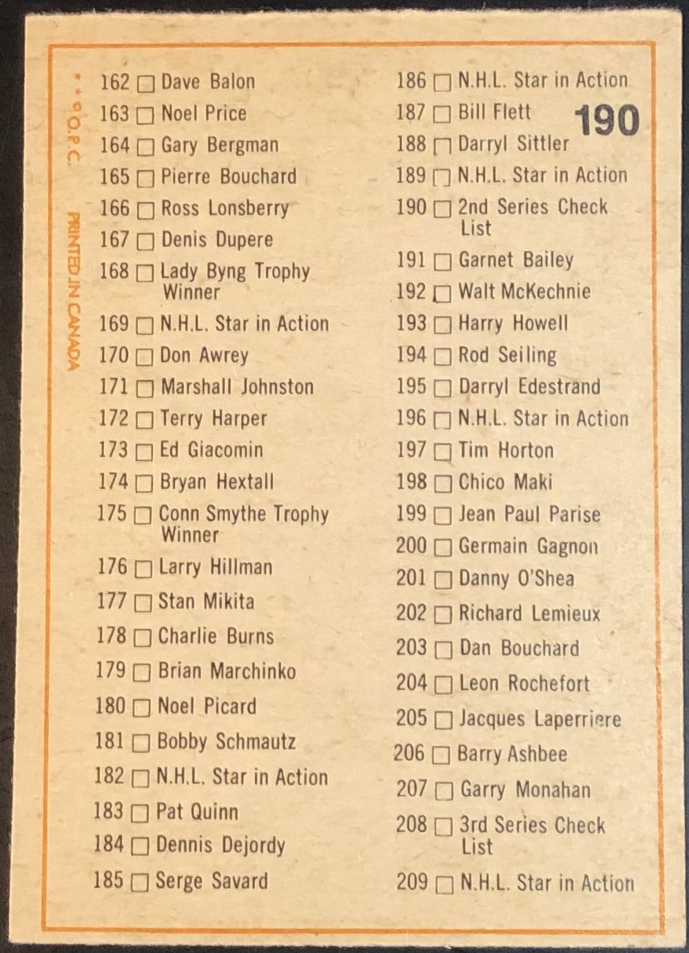 Card #190 hockey, OPC, vintage