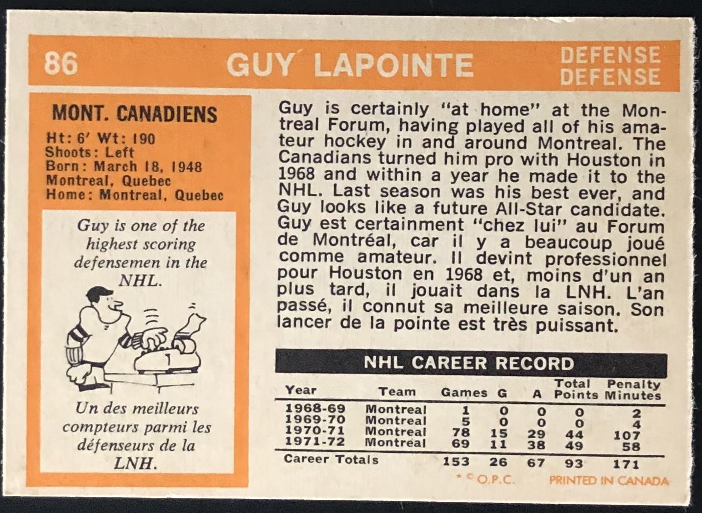Card #86 NHL, hockey, vintage, OPC, hall of fame