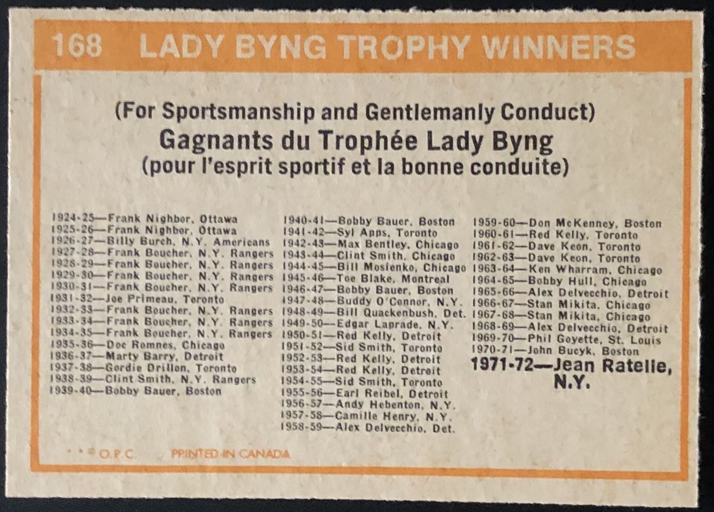 Card #168 NHL, hockey, vintage, OPC