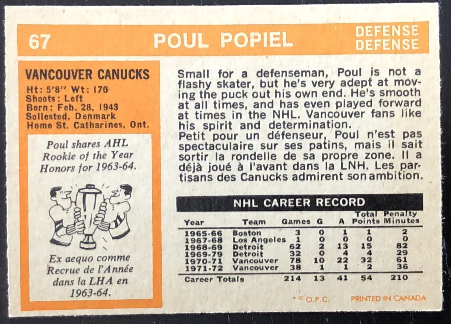 Card #67 NHL, hockey, vintage, rookie, OPC