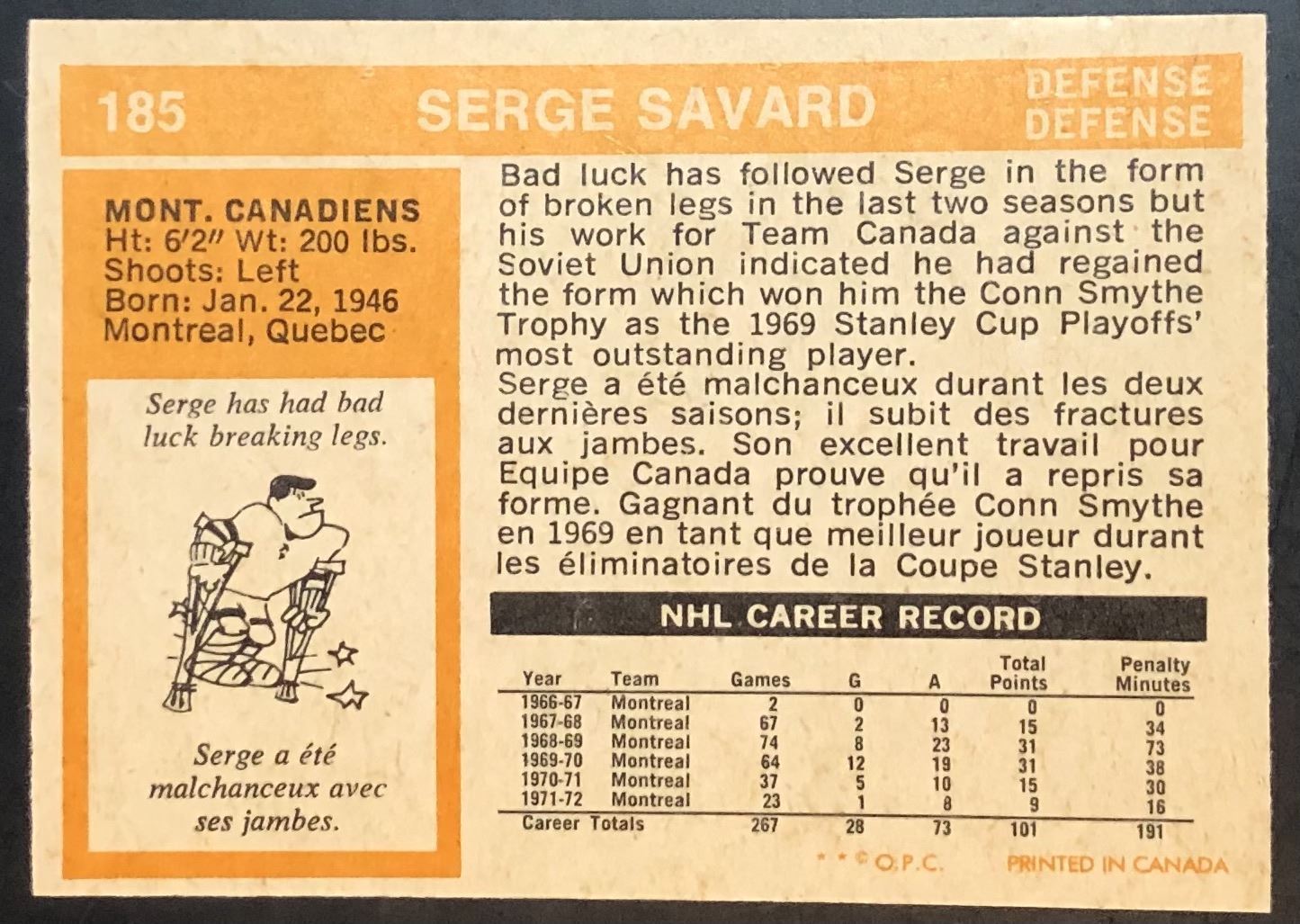 Card #185 NHL, hockey, OPC, vintage, hall of fame