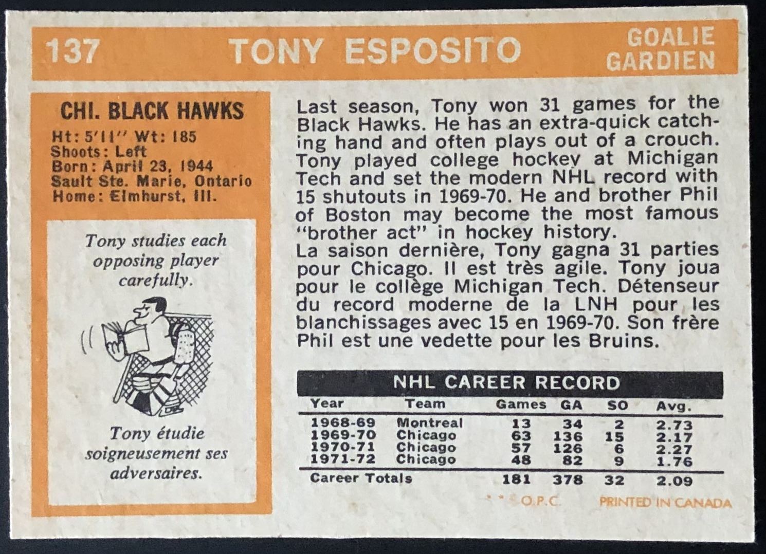 Card #137 NHL, hockey, vintage, OPC, hall of fame