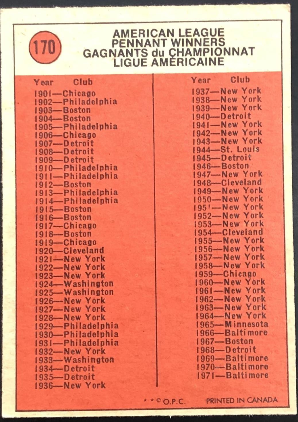 Card #170 OPC, vintage, MLB, baseball, hall of fame