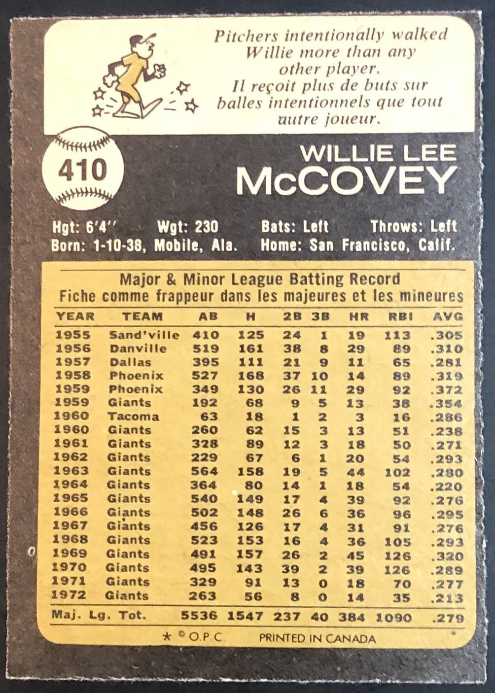 Card #410 MLB, baseball, vintage, OPC, hall of fame