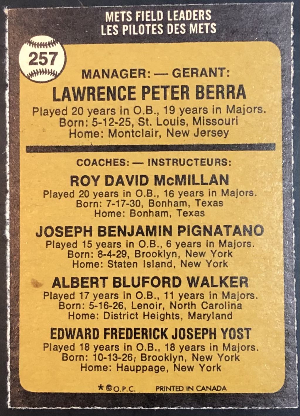 Card #257 MLB, baseball, vintage, OPC, hall of fame