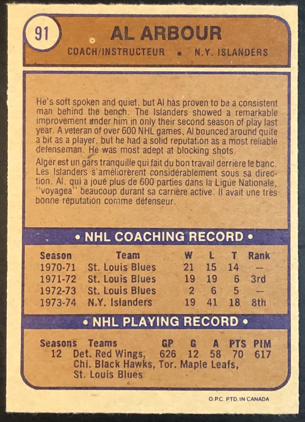 Card #91 NHL, hockey, vintage, OPC, hall of fame