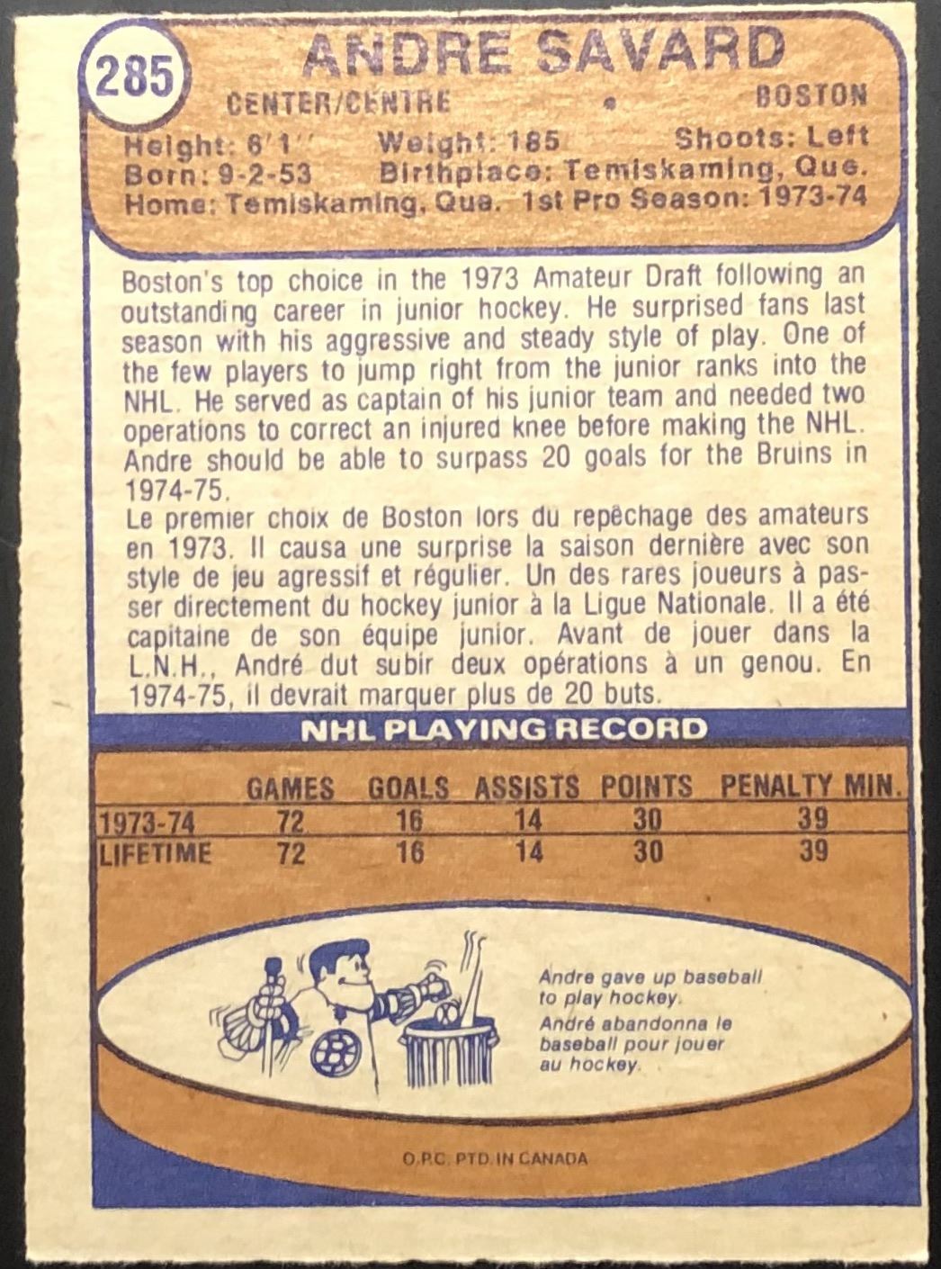 Card #285 OPC, vintage, NHL, hockey, rookie