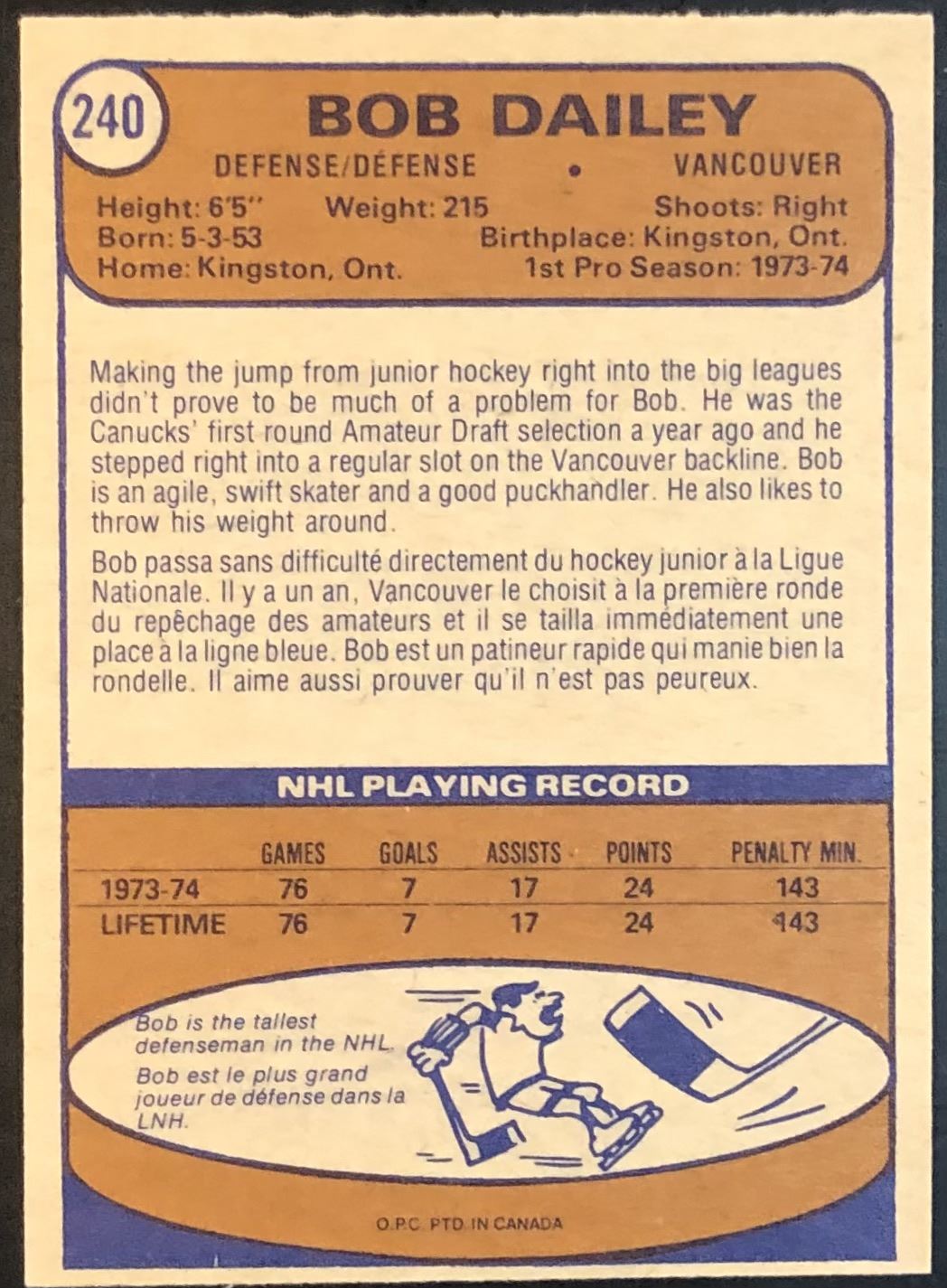 Card #240 NHL, hockey, vintage, OPC, rookie