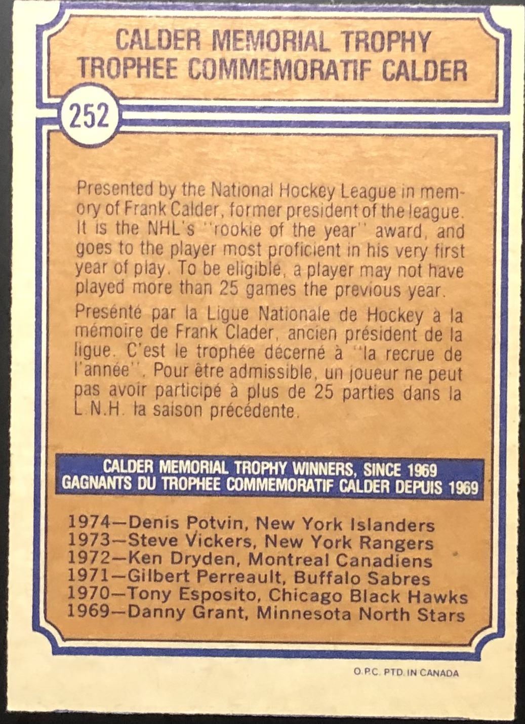 Card #252 OPC, vintage, NHL, hockey, hall of fame