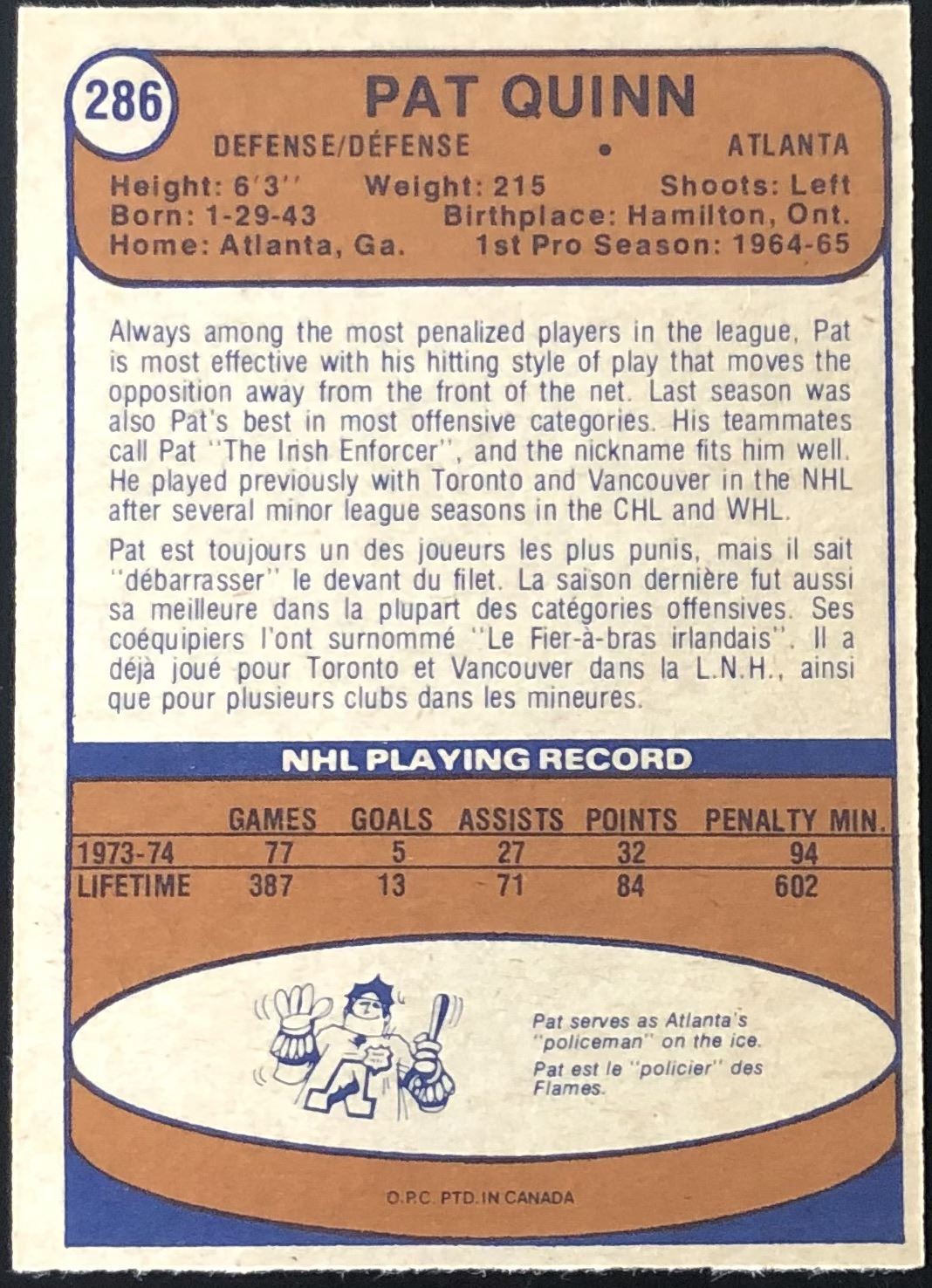 Card #286 NHL, hockey, vintage, OPC, hall of fame