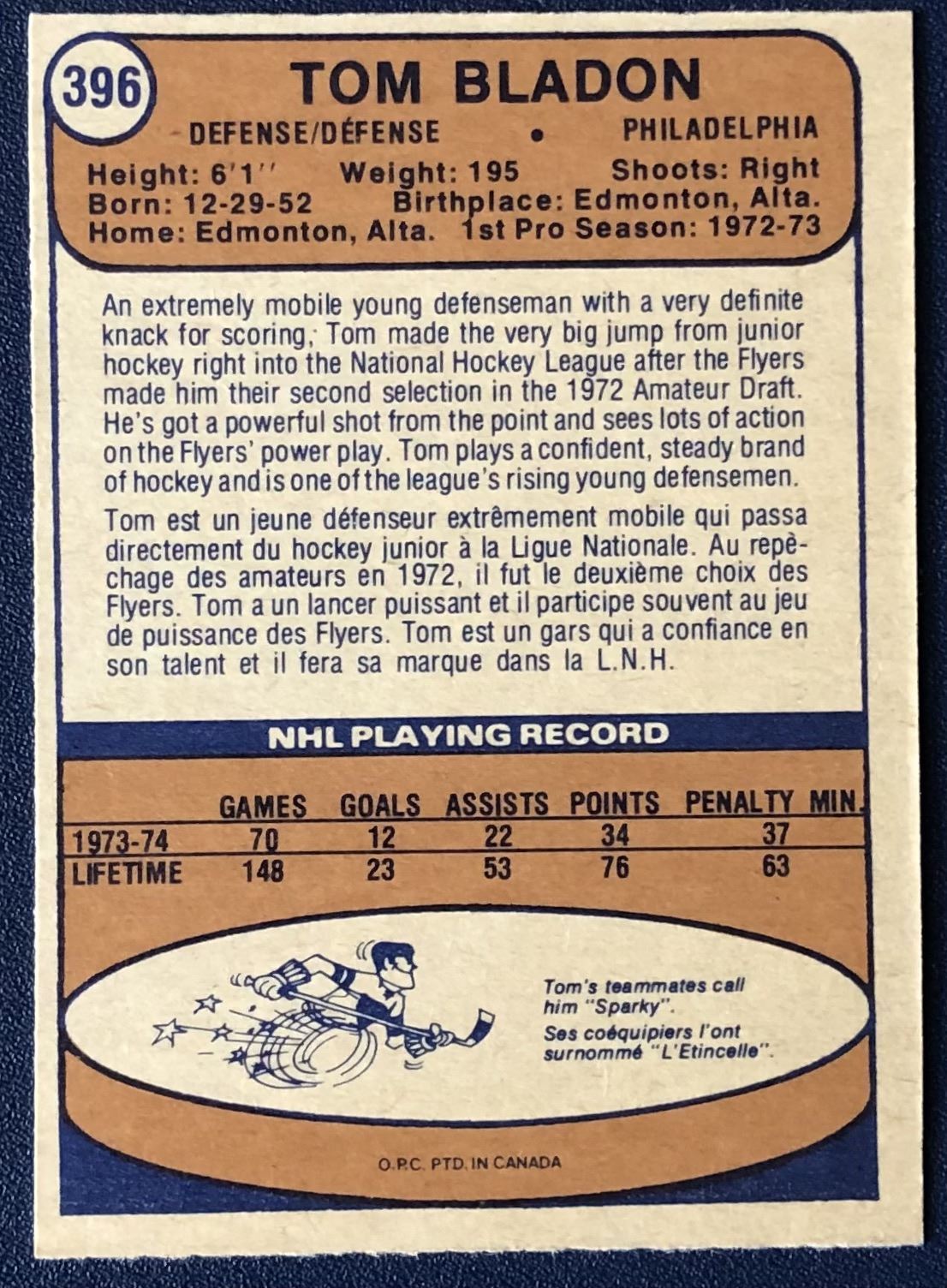 Card #396 vintage, rookie, hockey, NHL, OPC