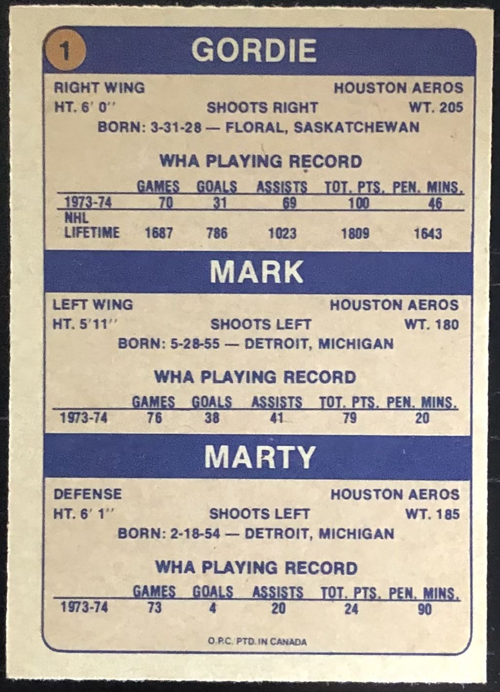 Card #1 WHA, hockey, OPC, hall of fame, vintage