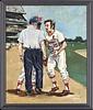 22" x 26" framed oil on canvas by painter Geri Esham, picturing Cardinal Tim McCarver arguing a call at the plate. Three small holes on the canvas which can easily be repaired.