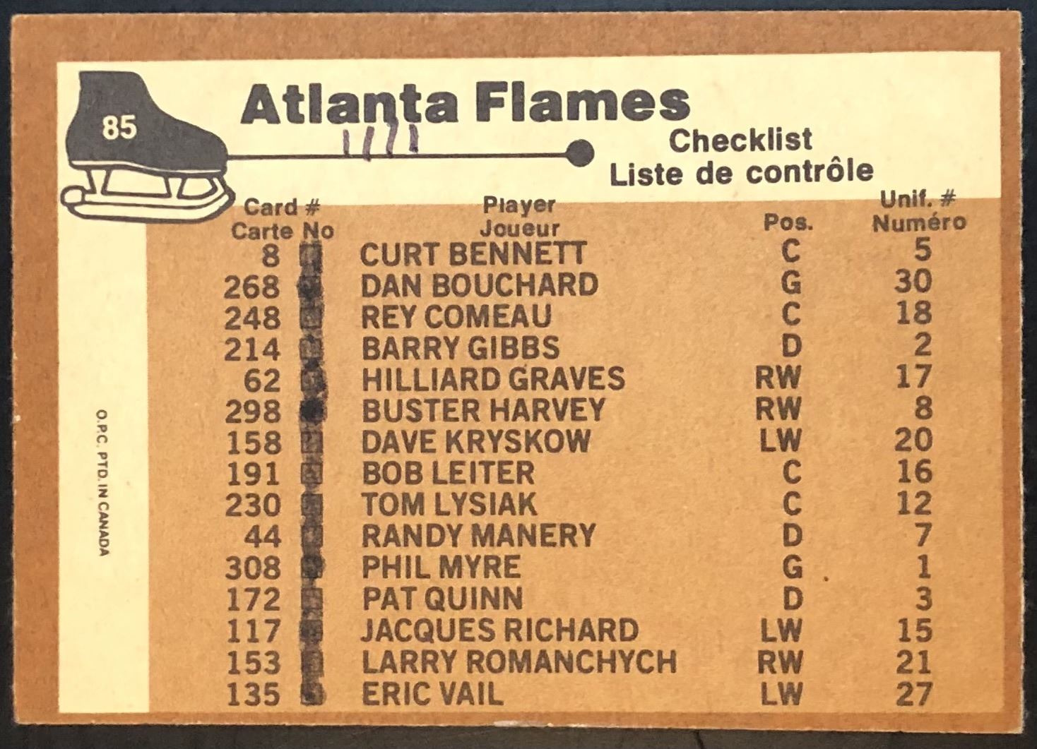 Card #85, ink on back NHL, hockey, vintage, OPC