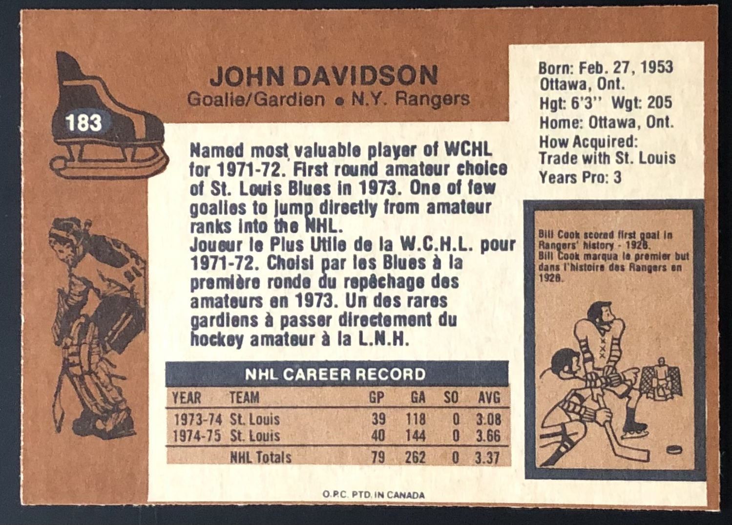 Card #183 NHL, hockey, OPC, vintage