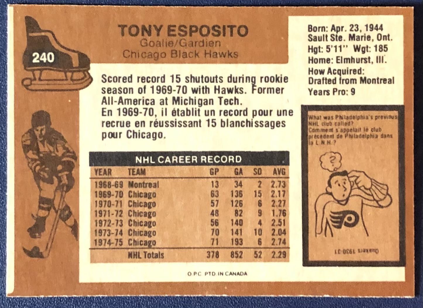 Card #240 hall of fame, OPC, NHL, vintage, hockey