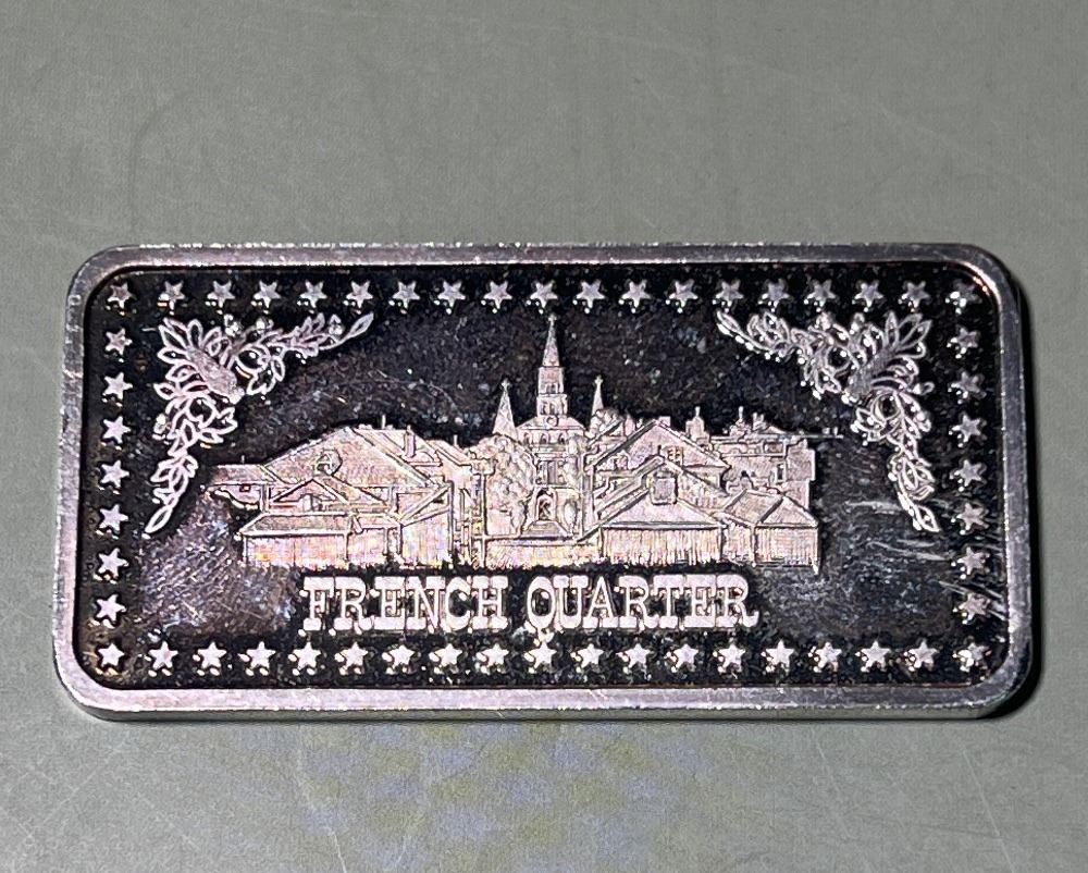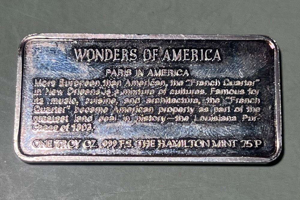 1975 French Quarter 1oz, 0.999 Purse Silver Bar, Wonders of America series.