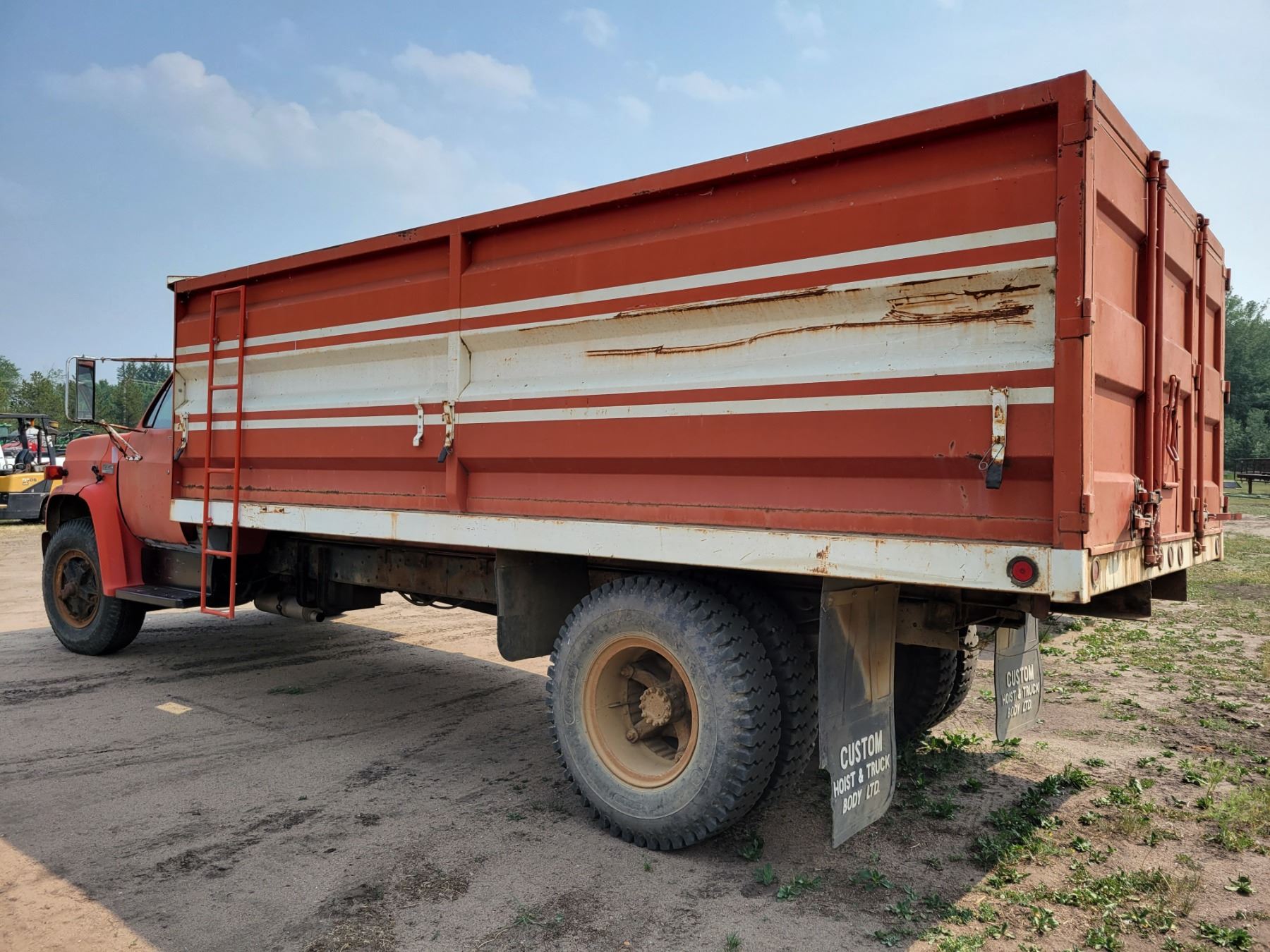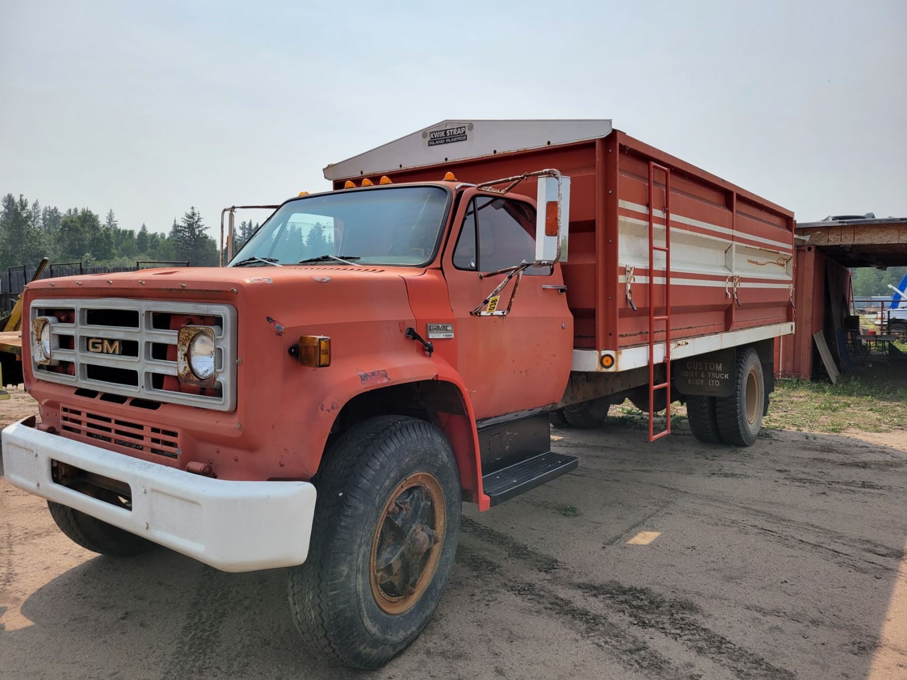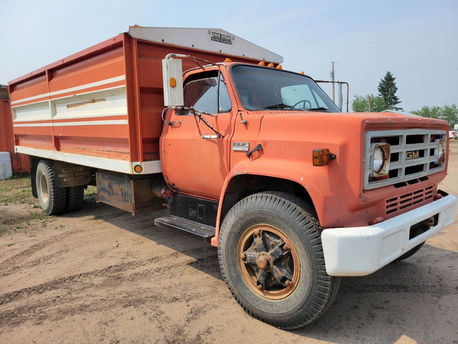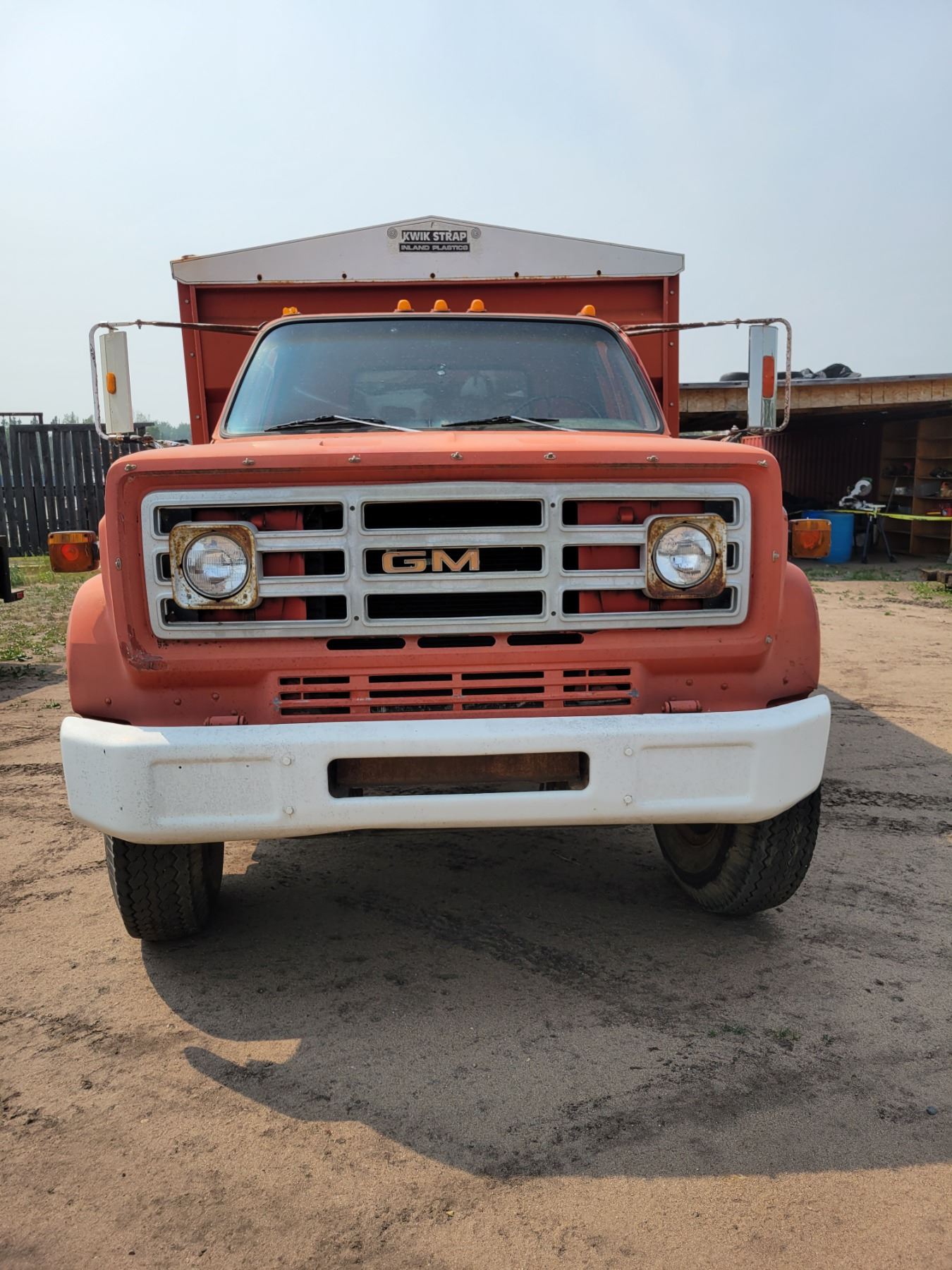 1975 Red GMC 6500 Grain truck, V8, 65,866 Km, 10.00-20 Rubbers, 18' x 8'4" x 54"H Box, SN. TCE675V610569, Body rust