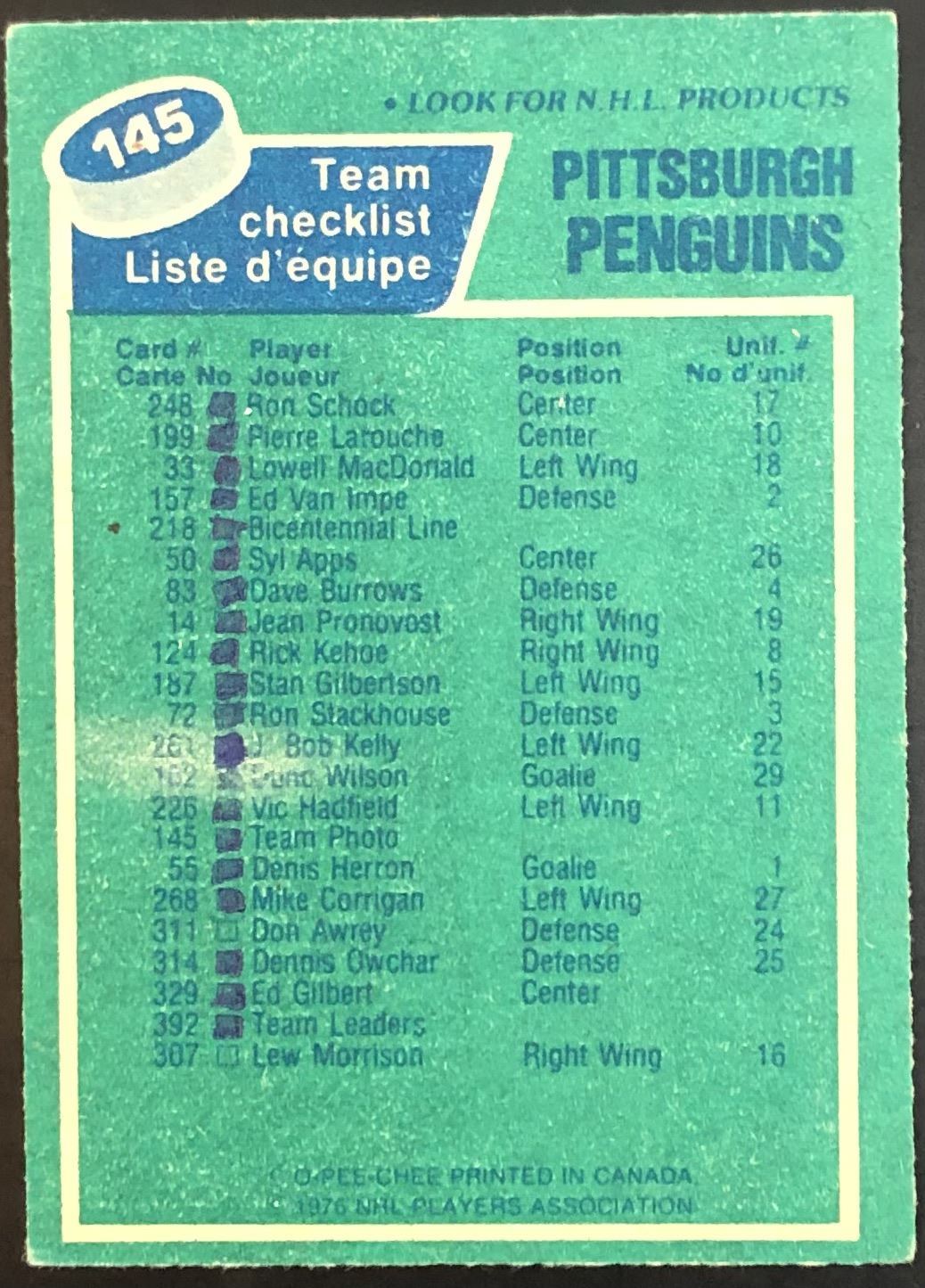 Card #145, ink on back NHL, hockey, vintage, OPC