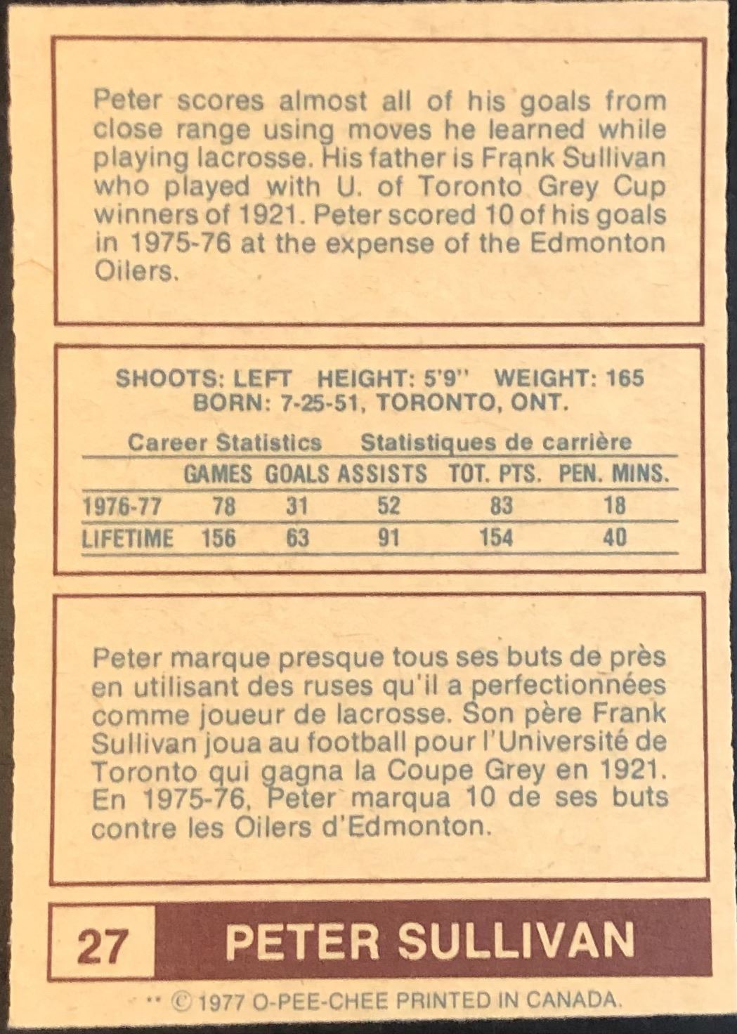 Card #27 WHA, hockey, vintage, OPC