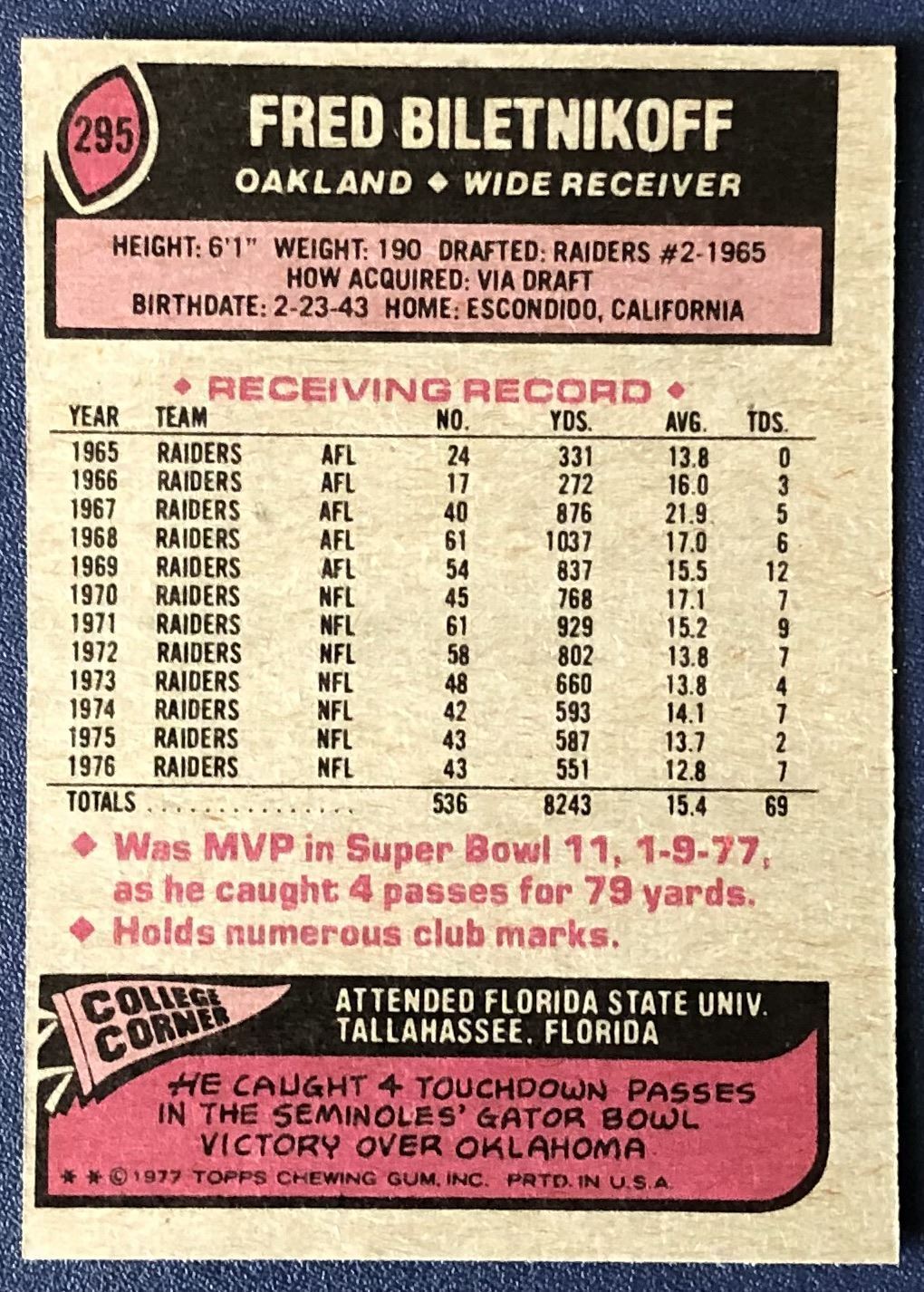 Card #295 NFL, football, vintage, hall of fame