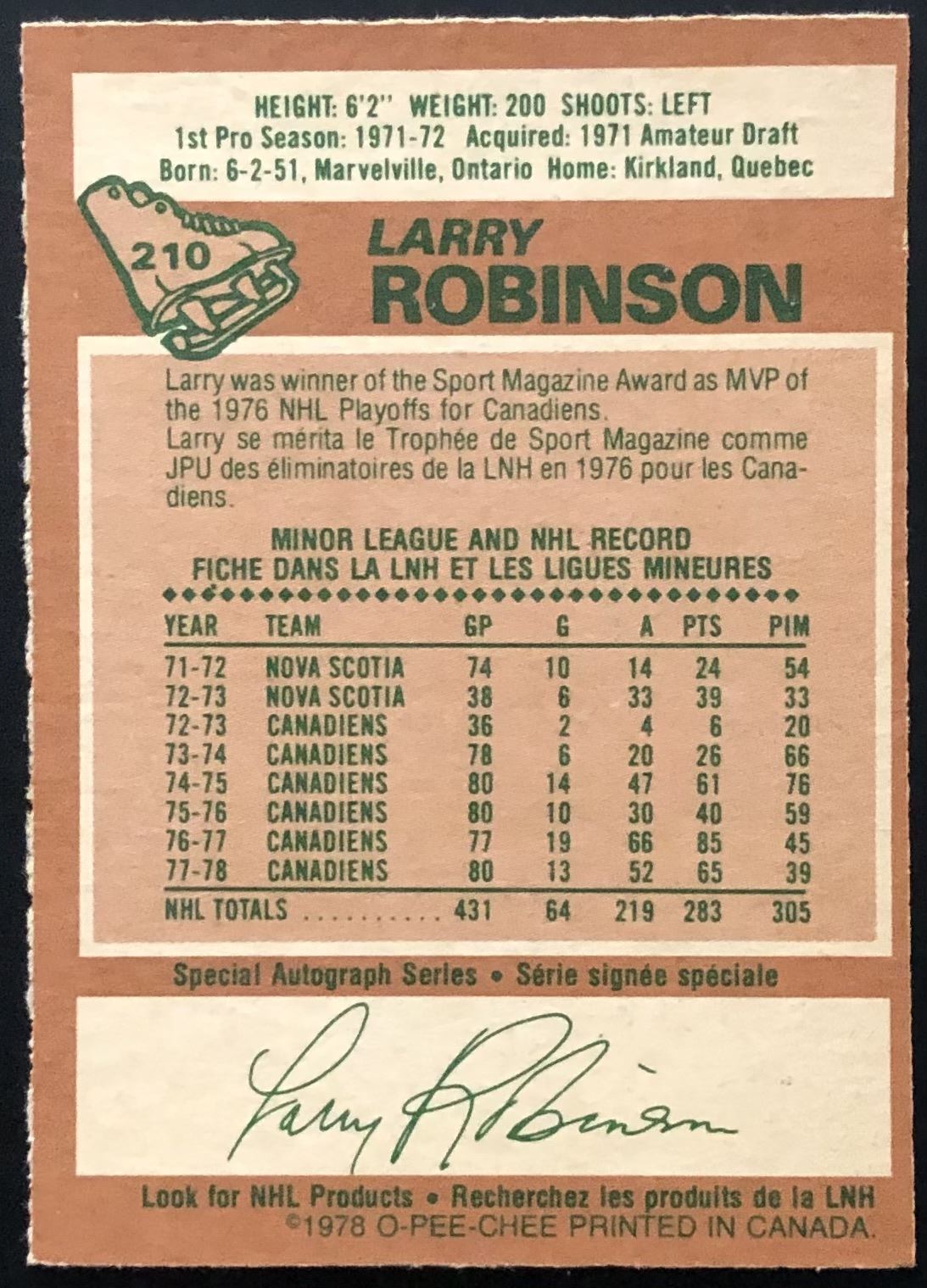 Card #210 NHL, hockey, OPC, vintage, hall of fame, autograph