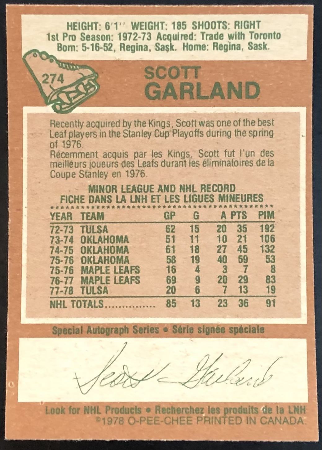Card #274 NHL, hockey, OPC, vintage, rookie