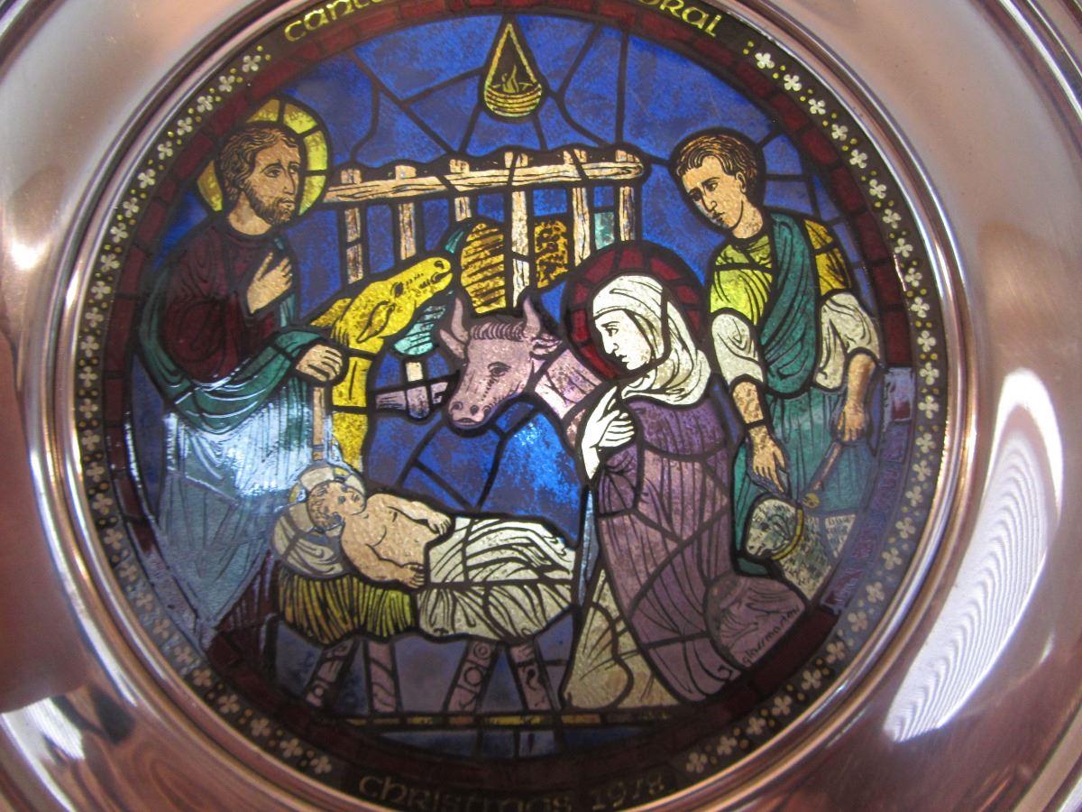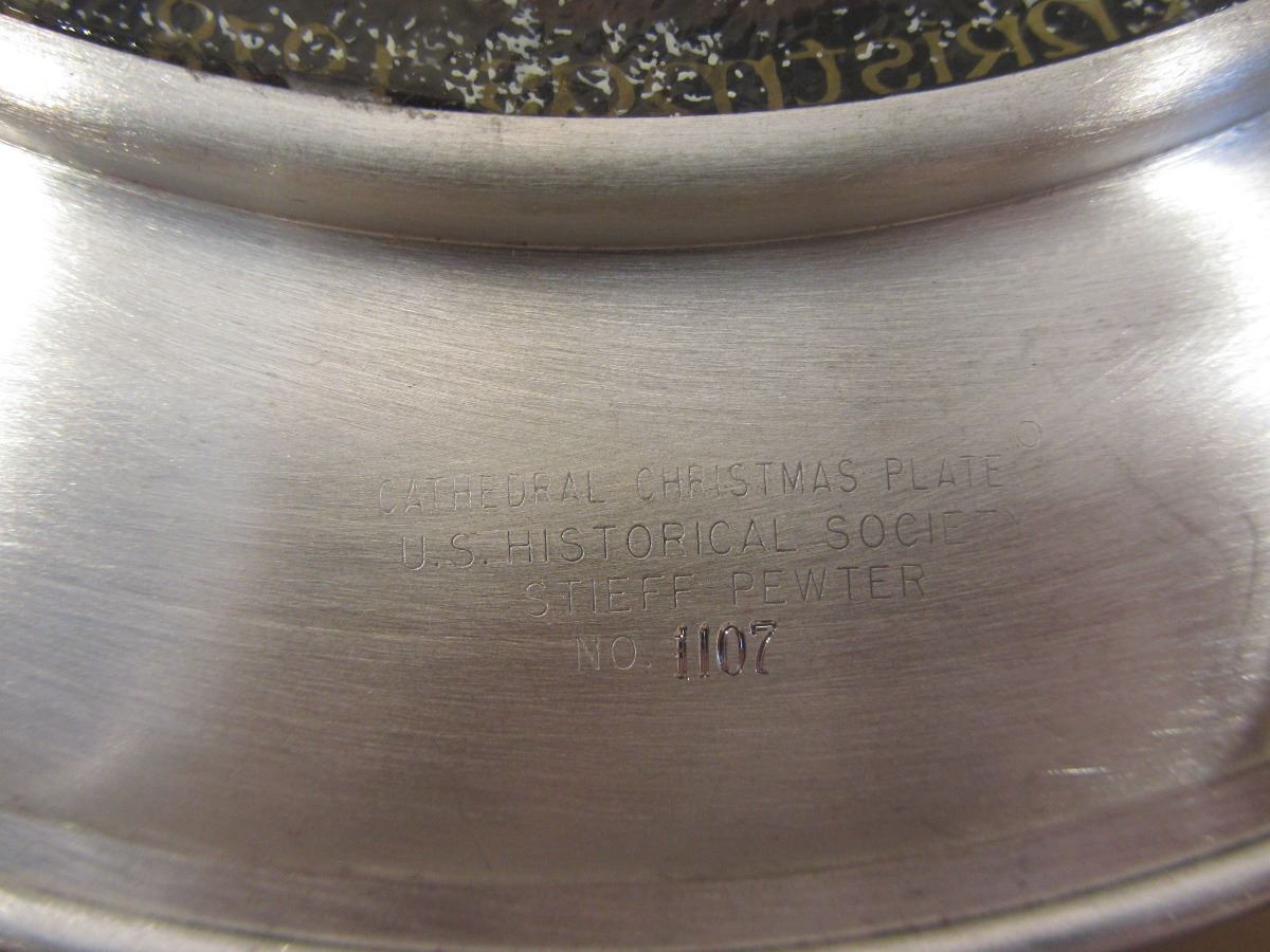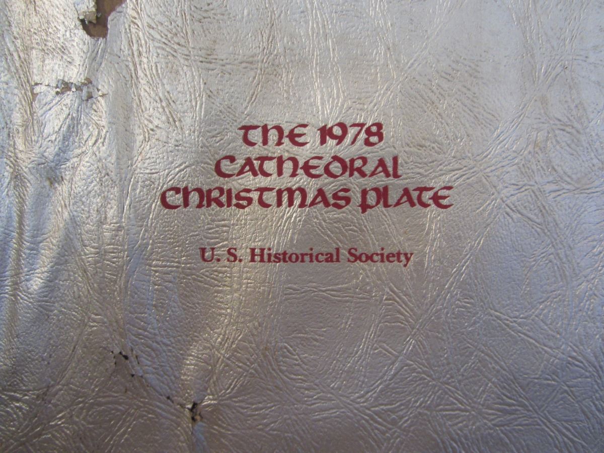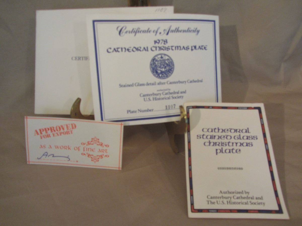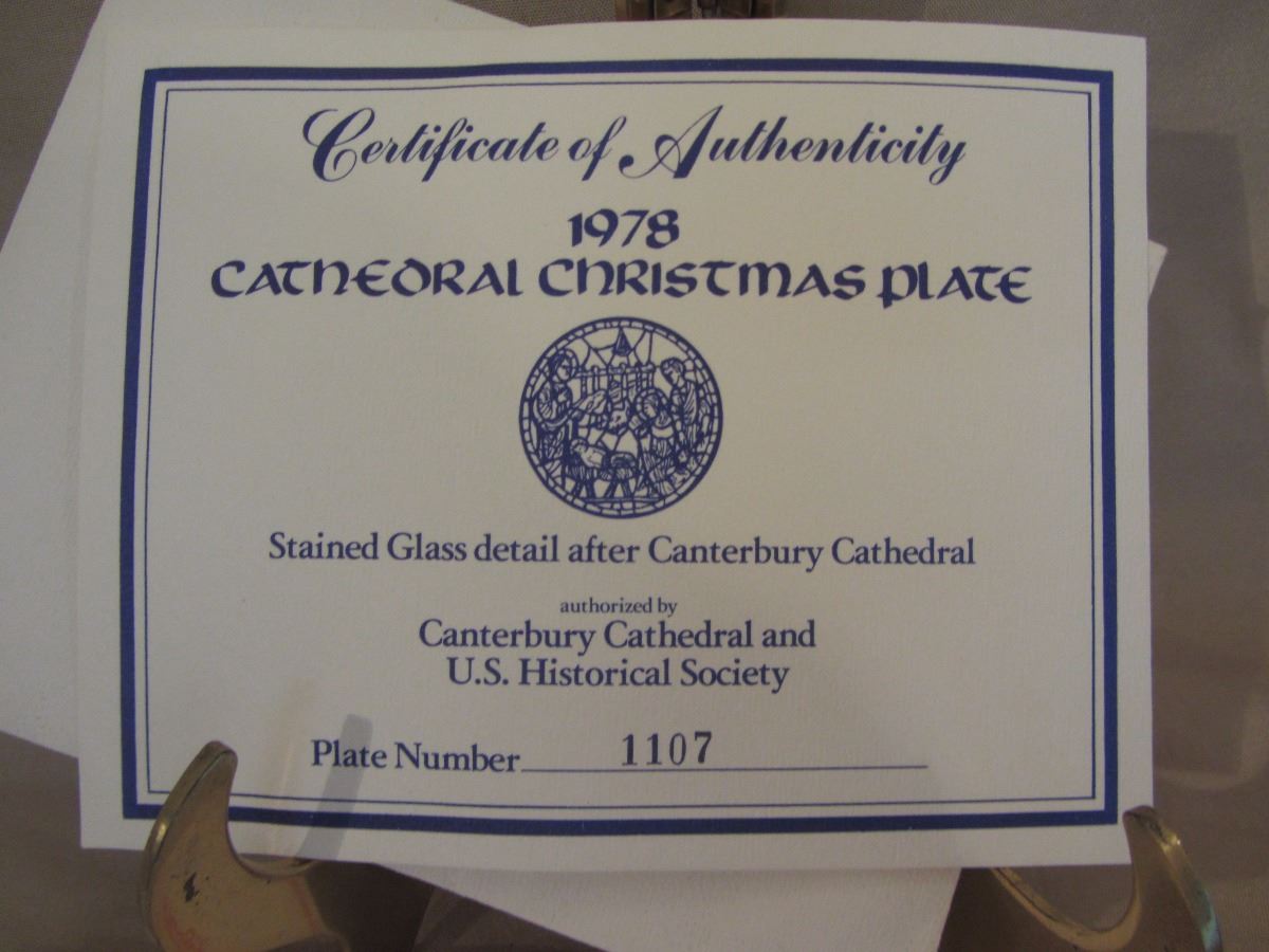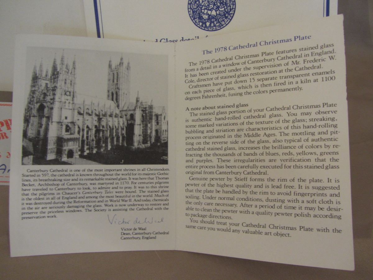 9 3/4" plate, dated 1978 'Cathedral Christmas Plate' Authorized by Canterbury Cathedral and The U.S. Historical Society. Plate is made of Pewter with a stained glass center piece. It is number 1107 comes in the original box with all original paperwork. (Please see images for details)
