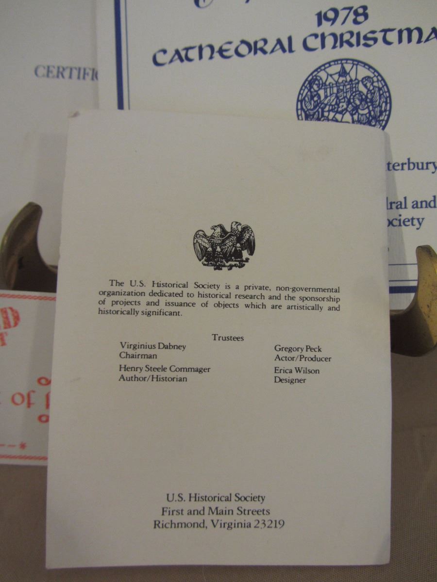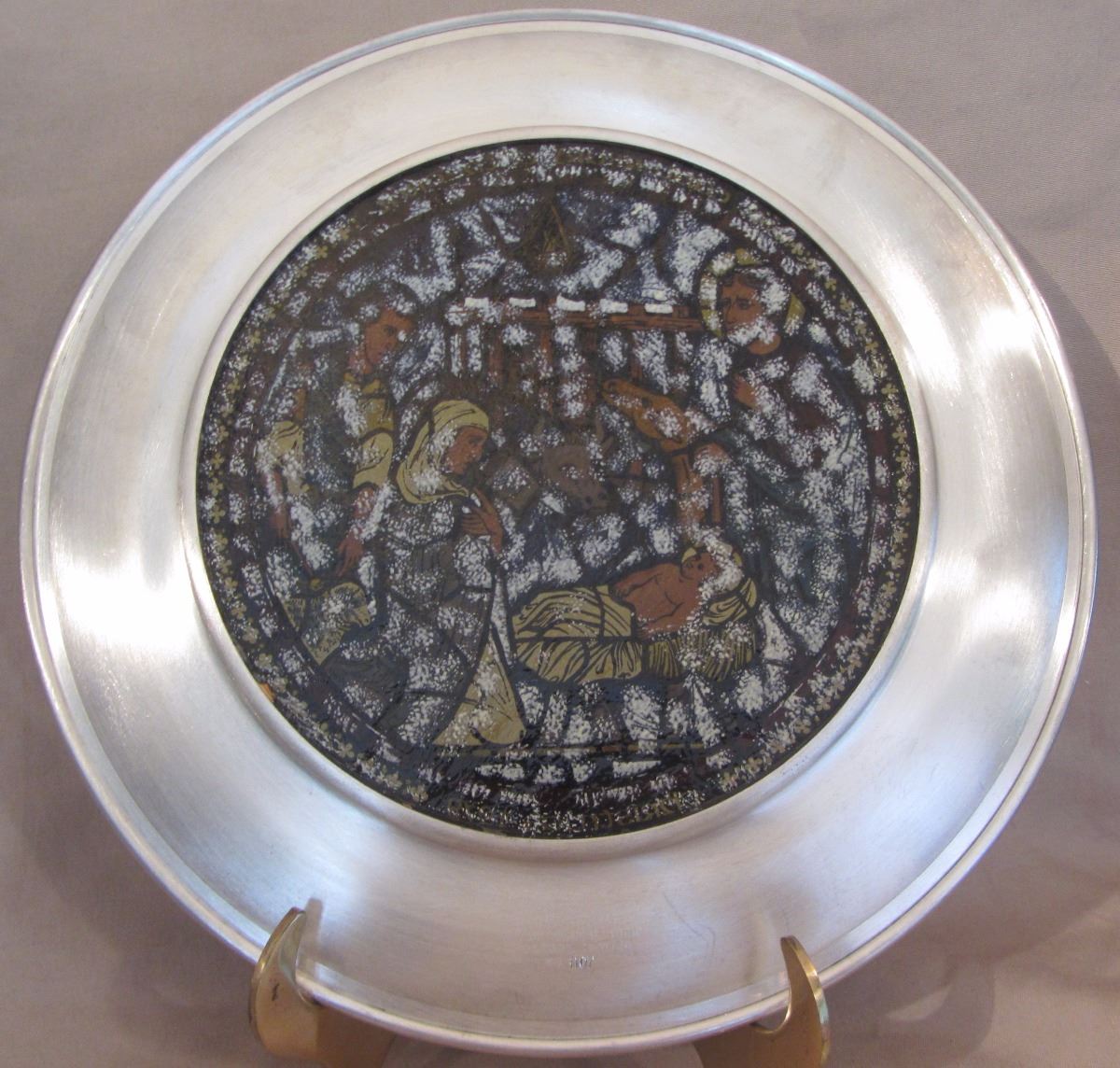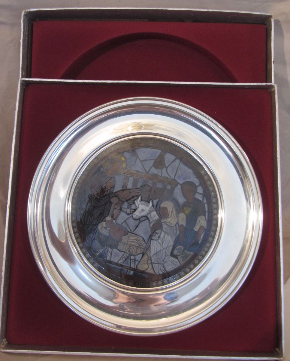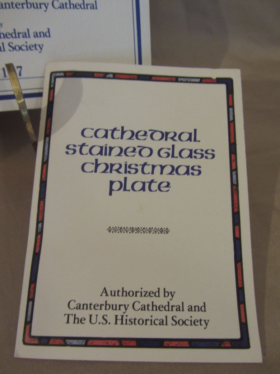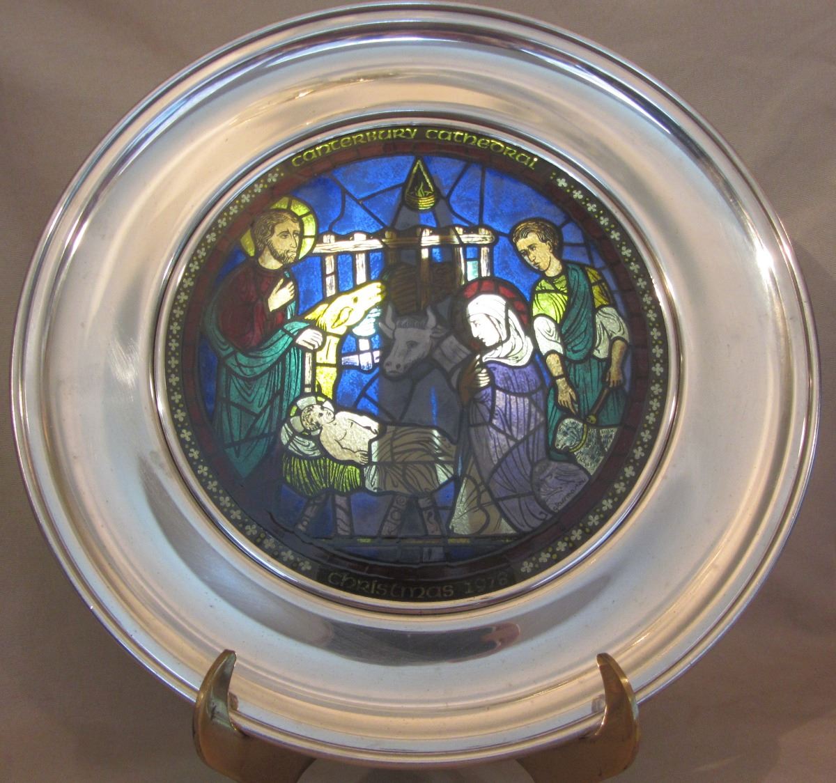 9 3/4" plate, dated 1978 'Cathedral Christmas Plate' Authorized by Canterbury Cathedral and The U.S. Historical Society. Plate is made of Pewter with a stained glass center piece. It is number 1107 comes in the original box with all original paperwork. (Please see images for details)