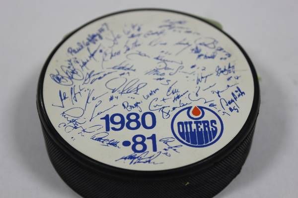 1980/81 LITHO TEAM SIGNED OILERS PUCK