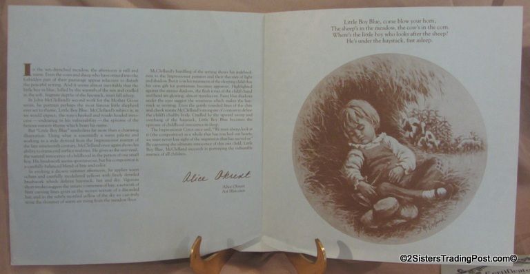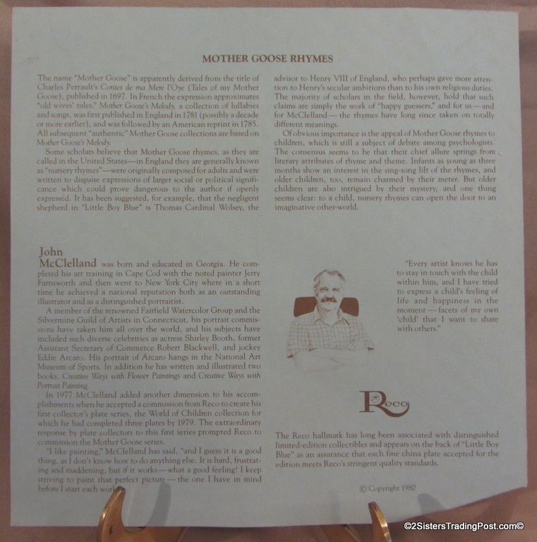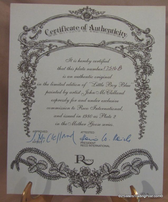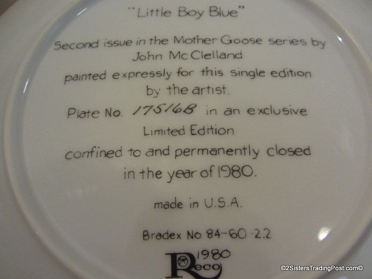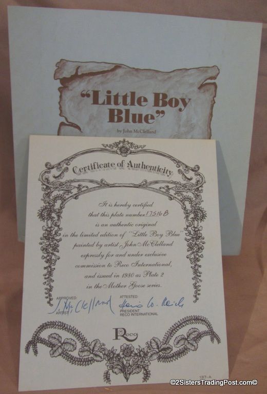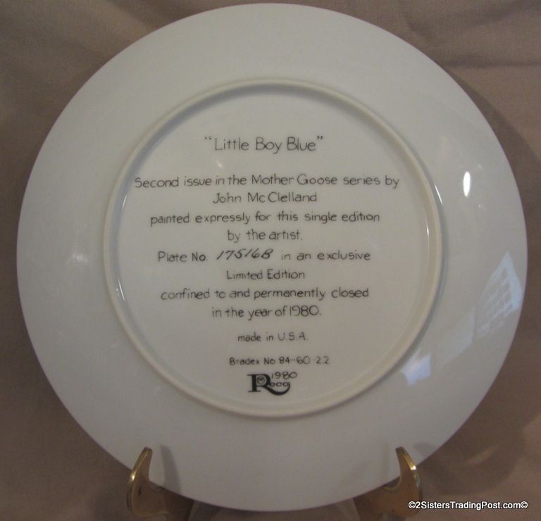 8 1/2" plate, dated 1980 'Little Boy Blue' it is the second issue in the Mother Goose series by John McClelland. Plate number 17516B Bradex Number 84-60-2.2. The plate is offered by the Reco Co. and comes in the original box with paperwork and COA. (Please see images for details)