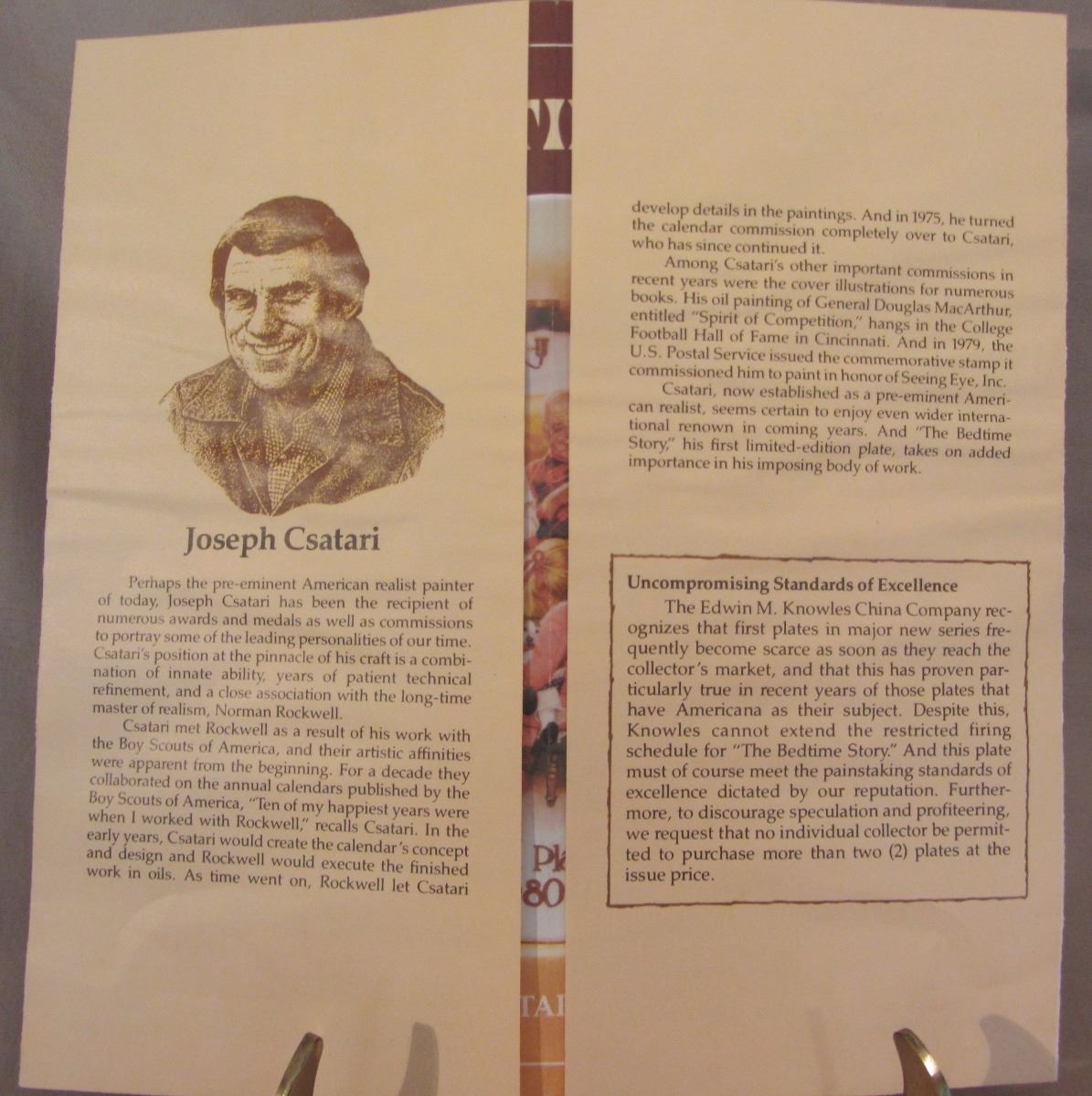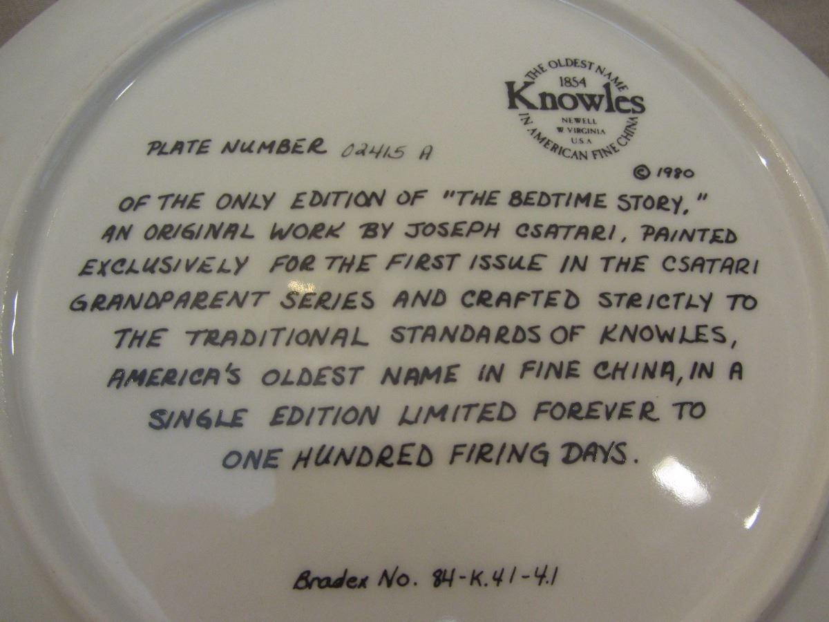 8 1/2" plate, dated 1980 'The Bedtime Story' this plate is the first issue in the Csatari Grandparent series by Joseph Csatari. The plate number is 02415A, Bradex Number: 84-K.41-4.1 and made available by Edwin M. Knowles Co. It comes in the original box, with paperwork and COA. (Please see images for details)