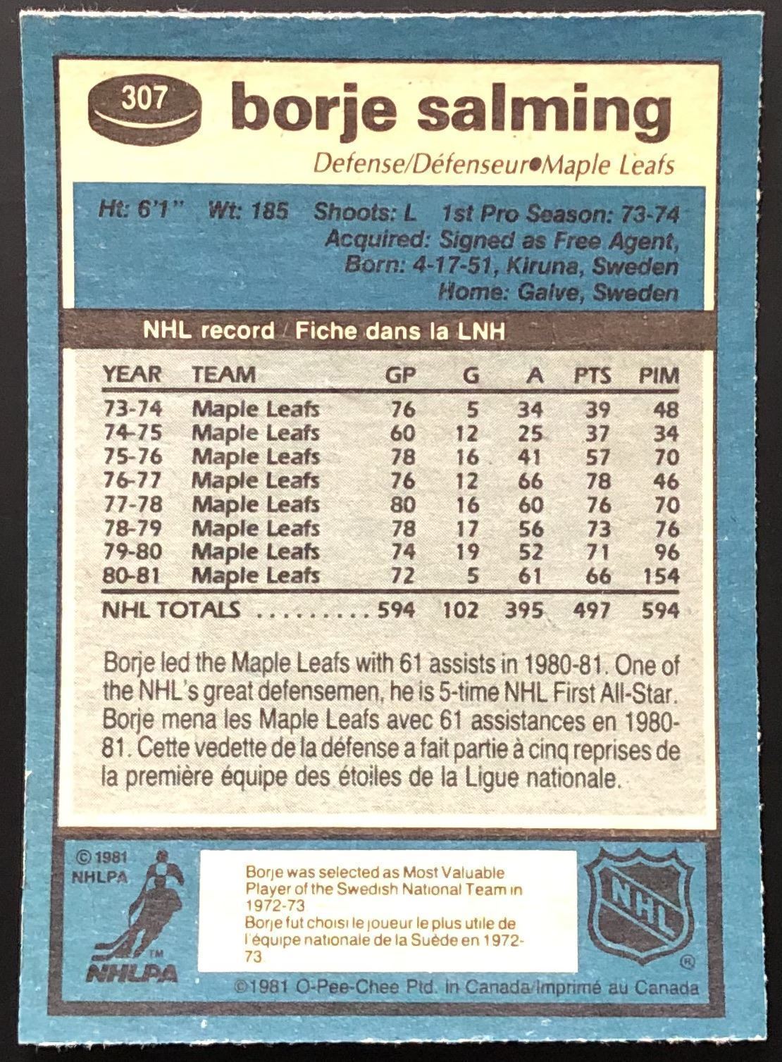 Card #307 NHL, hockey, OPC, vintage, hall of fame