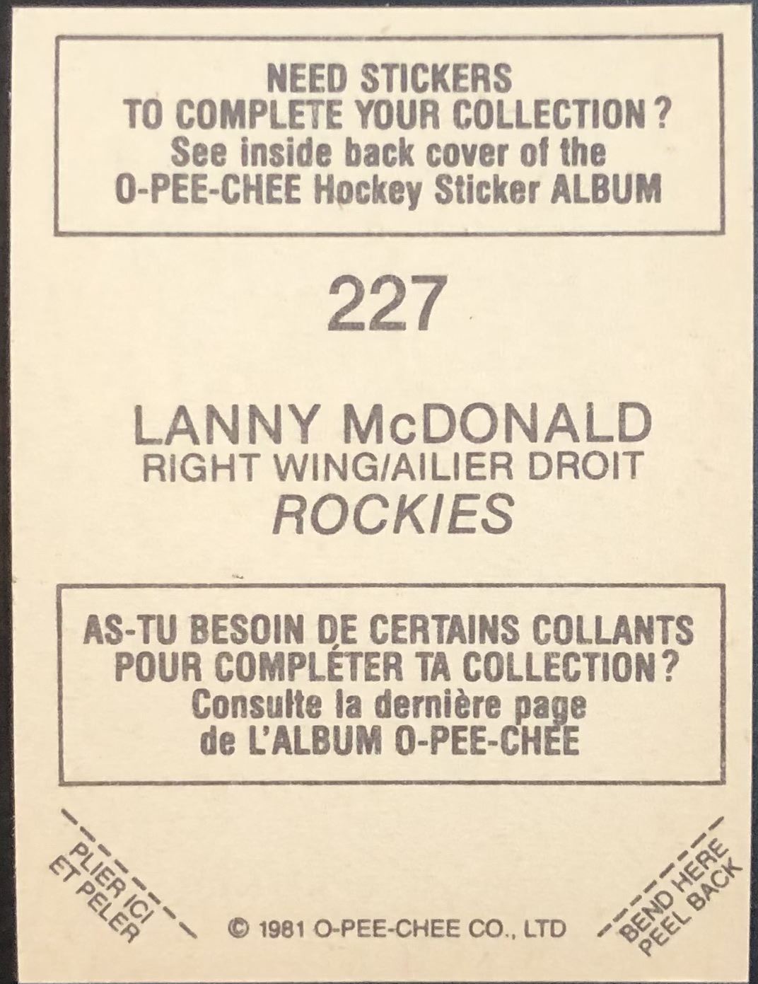 Sticker #227 NHL, hockey, OPC, vintage, hall of fame