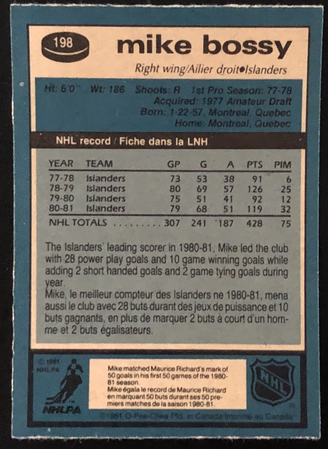 Card #198 NHL, hockey, vintage, OPC, hall of fame