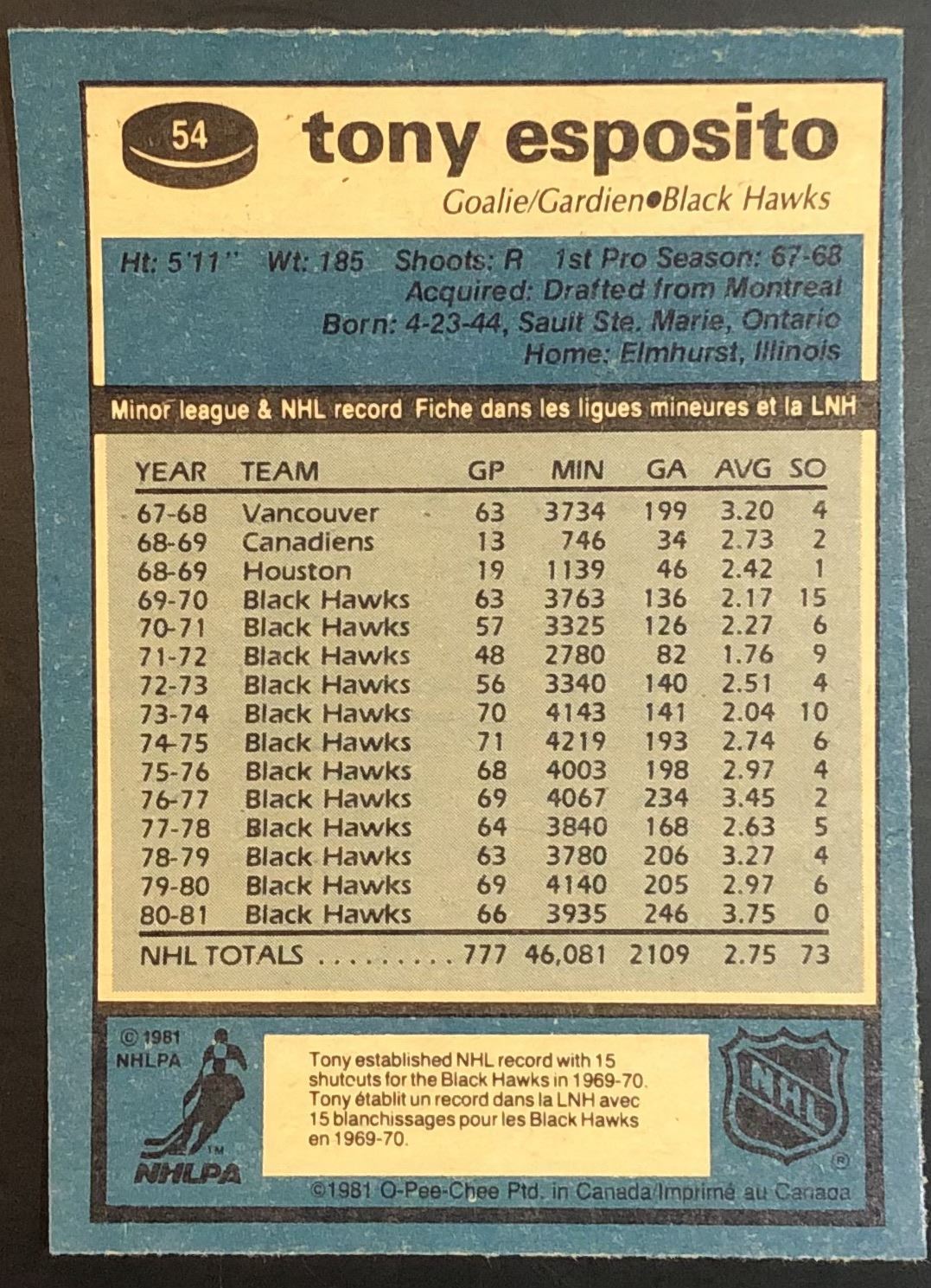 Card #54 NHL, hockey, OPC, vintage, hall of fame