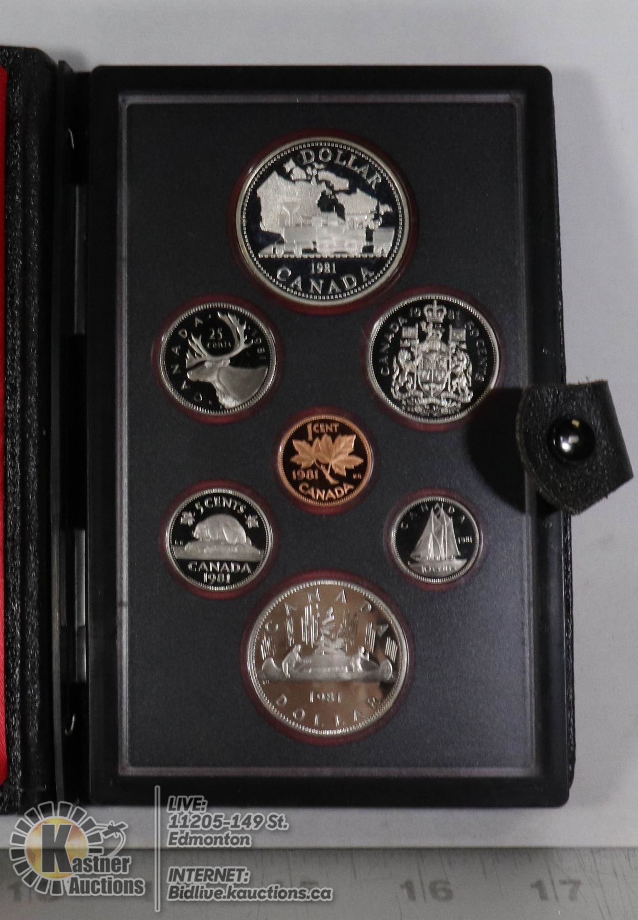 1981 PROOF SET OF CANADIAN COINAGE. SPECIMEN SILVER DOLLAR COIN COMMEMORATES THE 100TH ANNIVERSARY OF THE APPROVAL BY THE CANADIAN GOVERNMENT TO BUILD THE TRANS-CANADA RAILWAY.