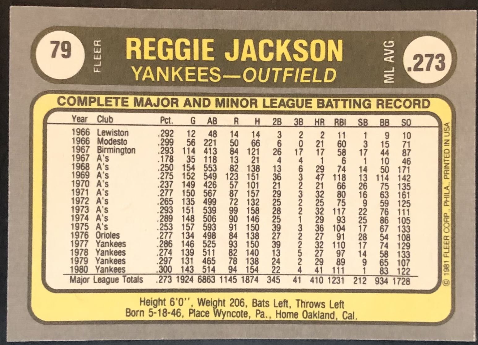 1981 FLEER REGGIE JACKSON (HOF) - ERROR CARD