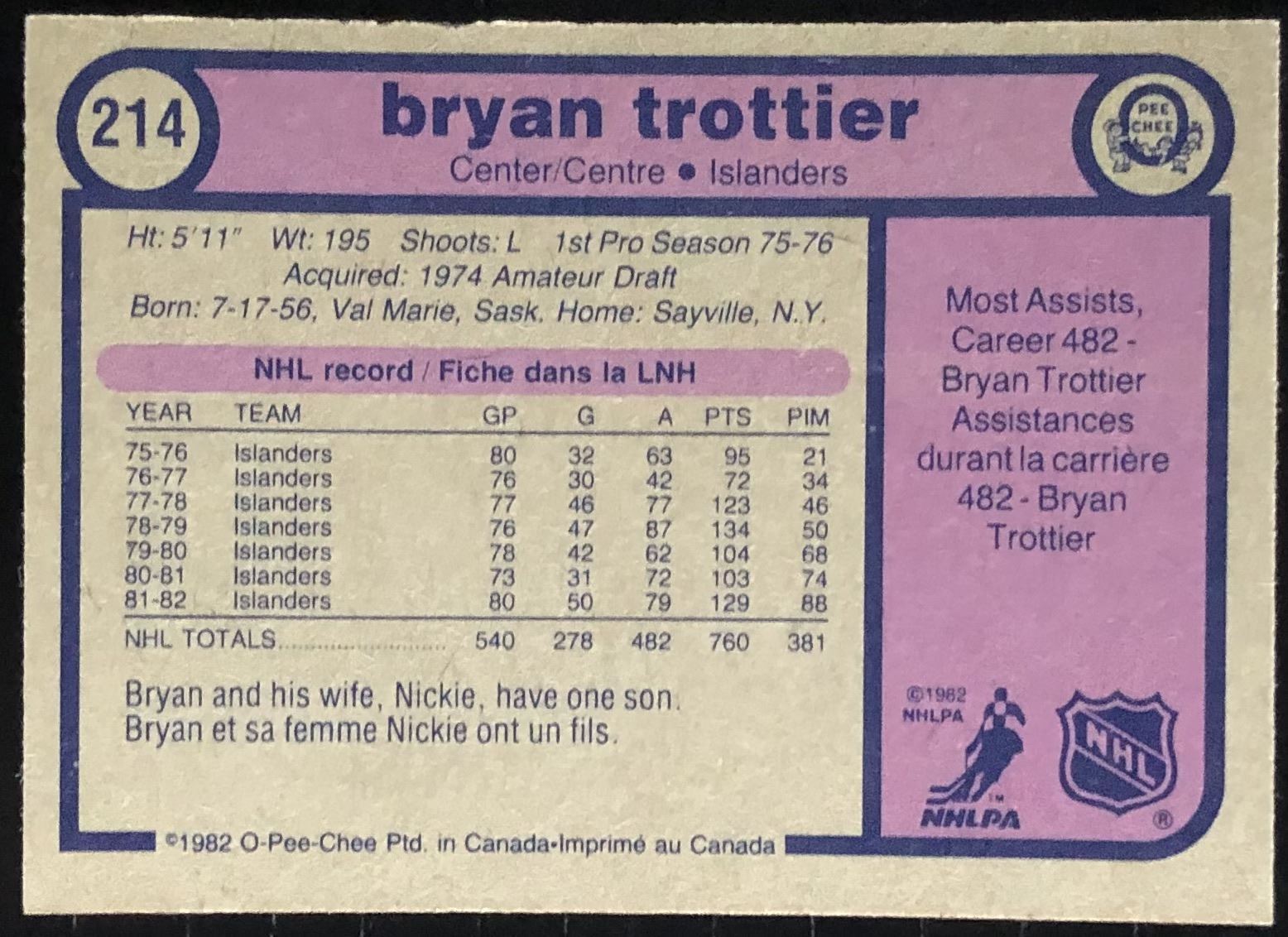 Card #214 NHL, hockey, vintage, OPC, hall of fame