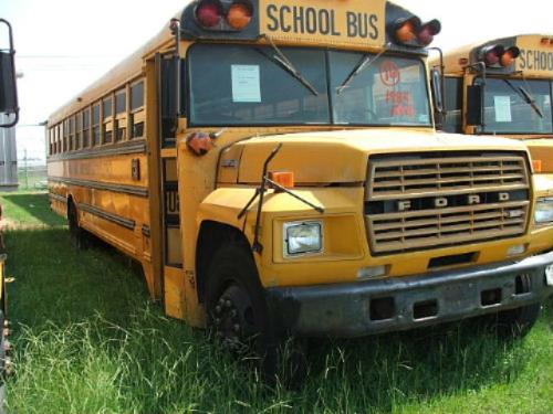 1983 FORD SCHOOL BUS/71 PASSENGER/THOMAS/AUTOMATIC/GAS ENGINE-370-2V/AIR BRAKES (CAGED)/INSPECTION: 10/06/MILEAGE NOT ACTUAL: 60,844, TIRES: FAIR CONDITION/BODY: FAIR CONDITION, FADED PAINT, HOOD HAS A SMALL HOLE, SEATS: FAIR TO POOR. (RUNNING CONDITION)