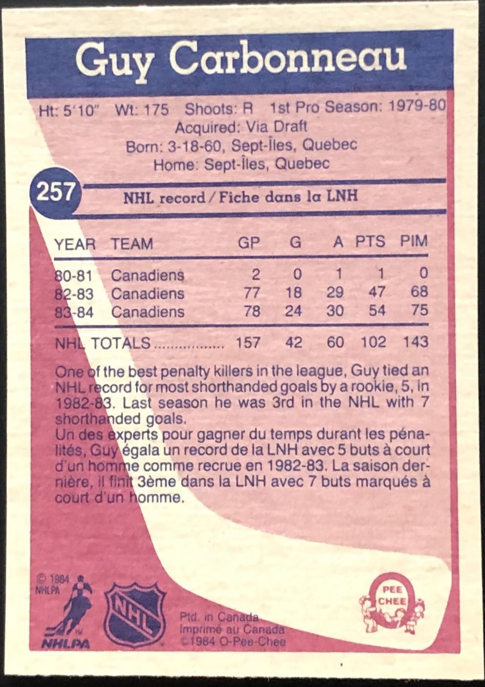 Card #257 NHL, hockey, vintage, OPC, hall of fame