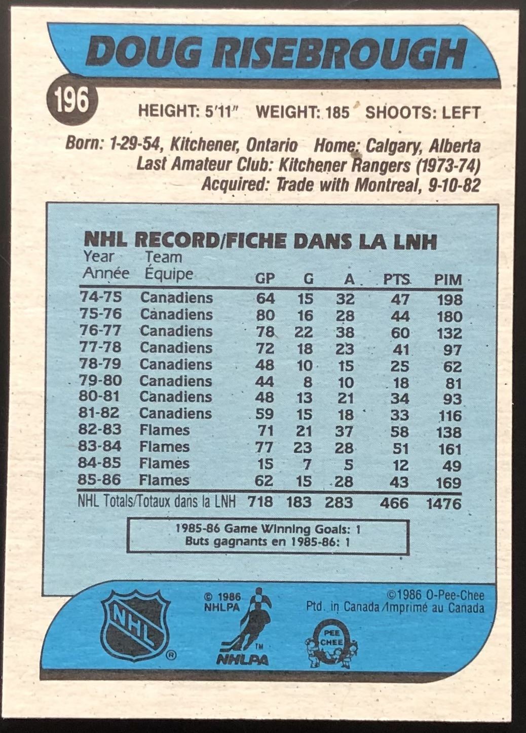 Card #196 NHL, hockey, vintage, OPC