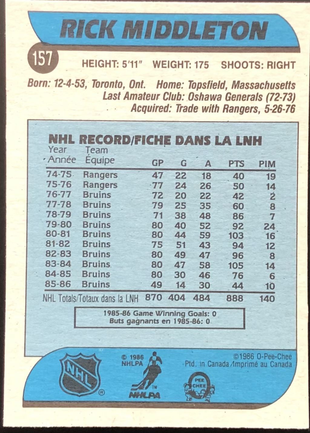 Card #157 NHL, hockey, vintage, OPC, hall of fame