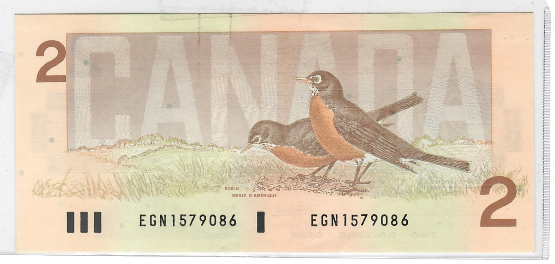 1986 BIRD SERIES (ROBBIN) CANADIAN $2 BANKNOTE