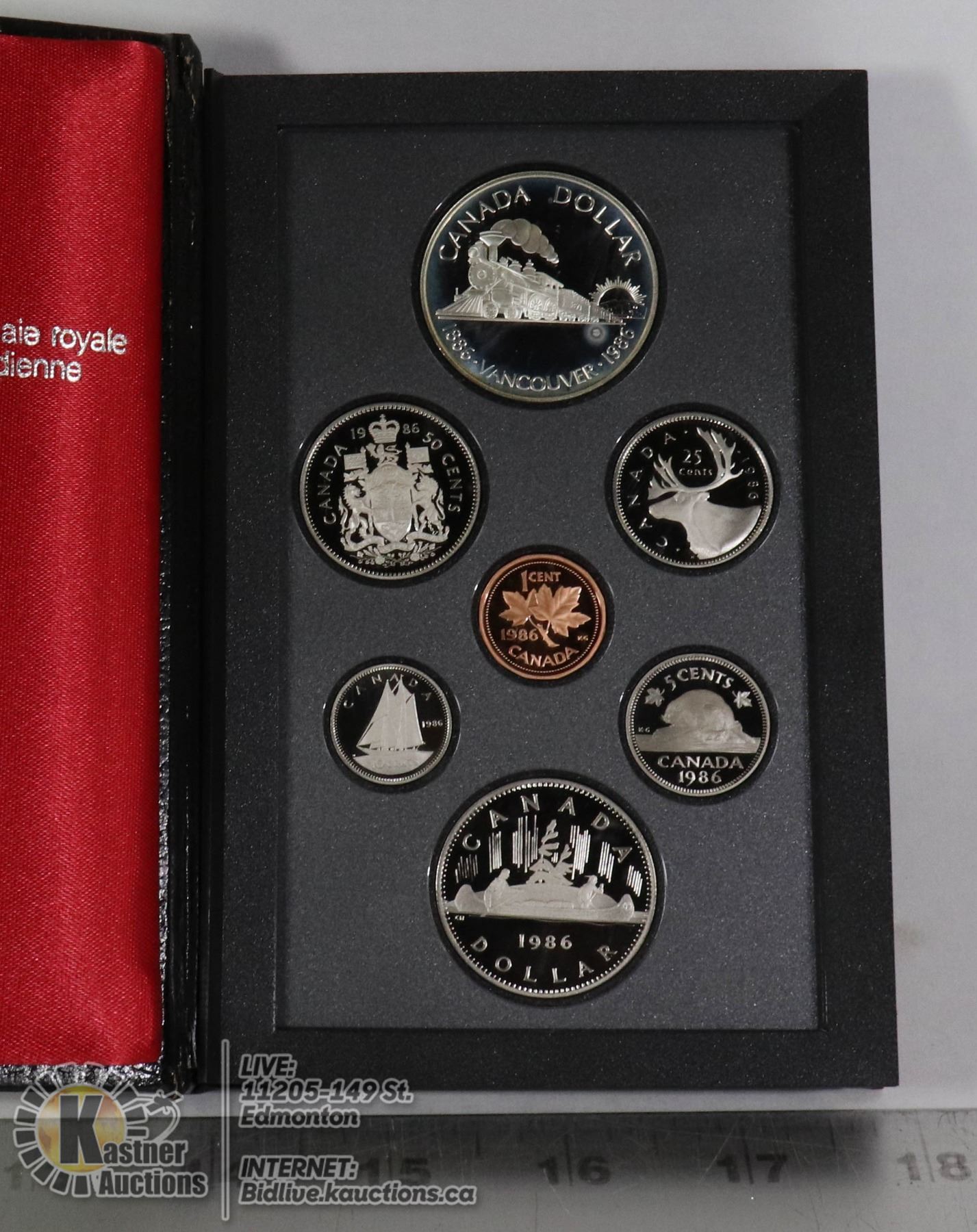 1986 PROOF SET OF CANADIAN COINAGE. THE 1986 CANADIAN SILVER DOLLAR MARKS THE 100TH ANNIVERSARY OF THE TRANSCONTINENTAL RAILROAD AND THE CENTENARY OF THE CITY OF VANCOUVER, BC.