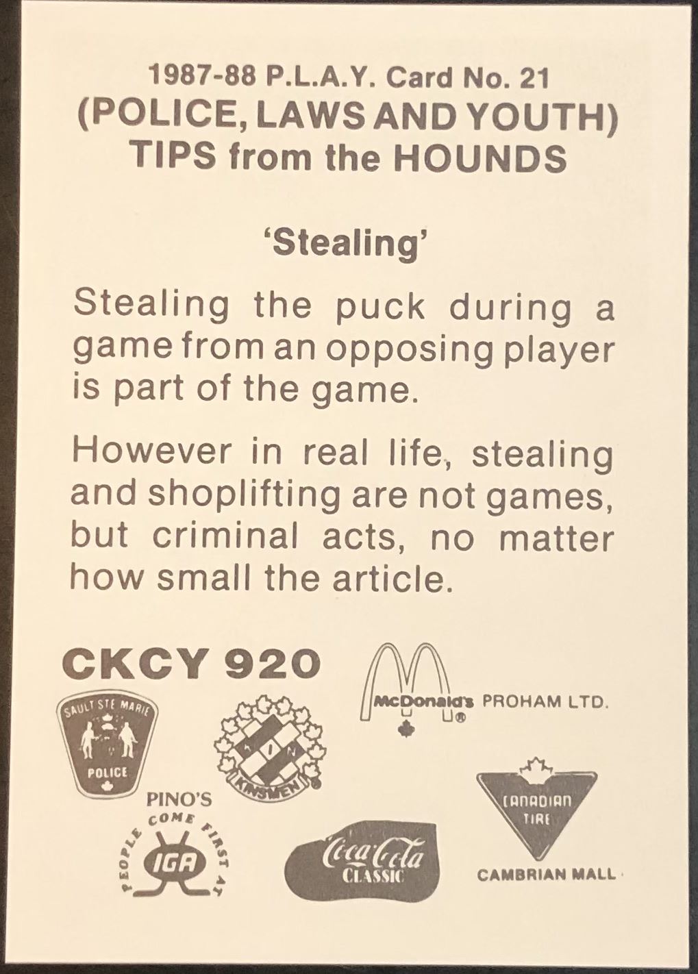 Card #21, card issued by Sault Ste. Marie (ON) Regional Police OHL, CHL, hockey, vintage, regional