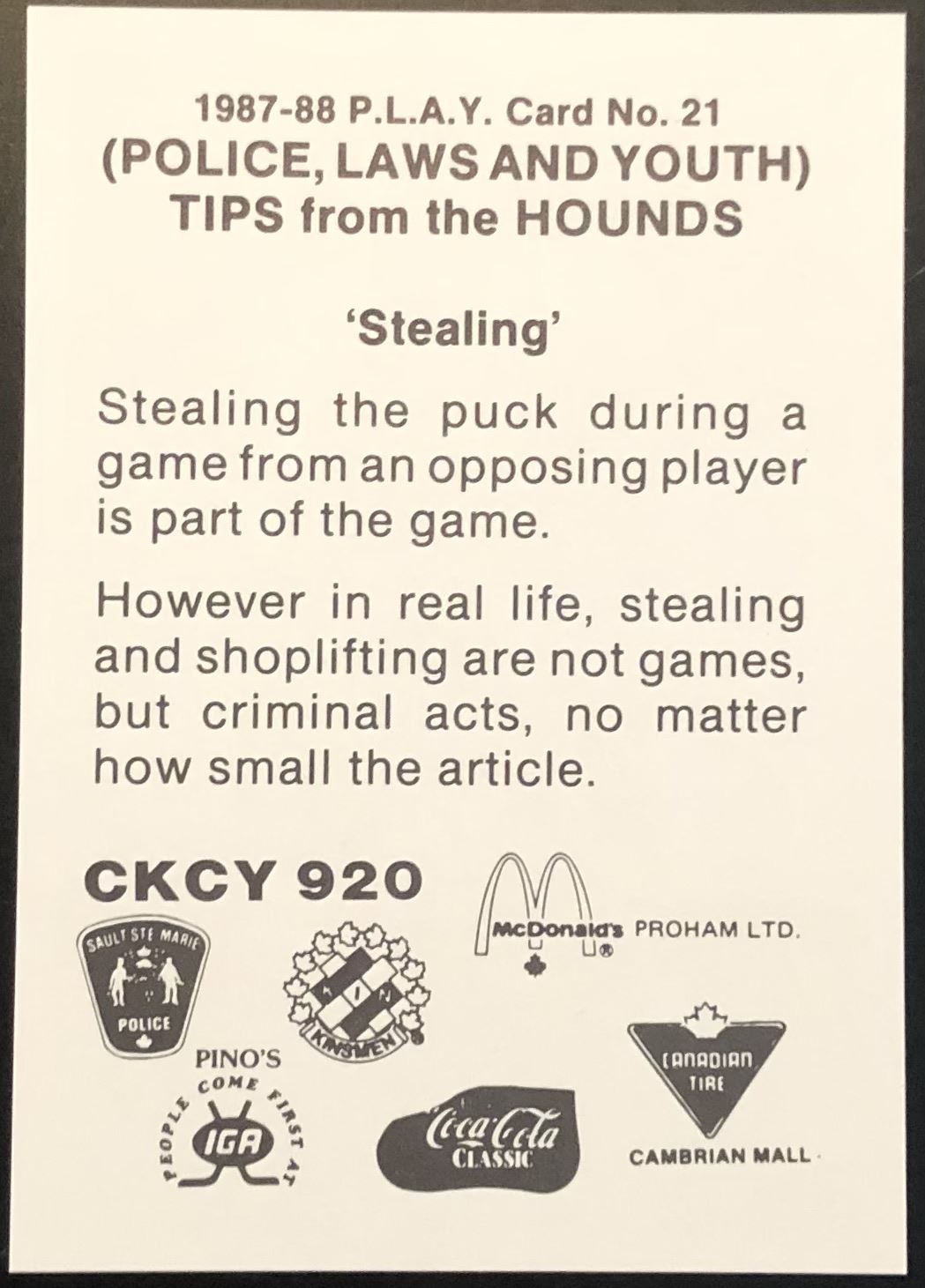 Card #21, issued by Sault St. Marie regional police CHL, hockey, vintage, regional, rookie