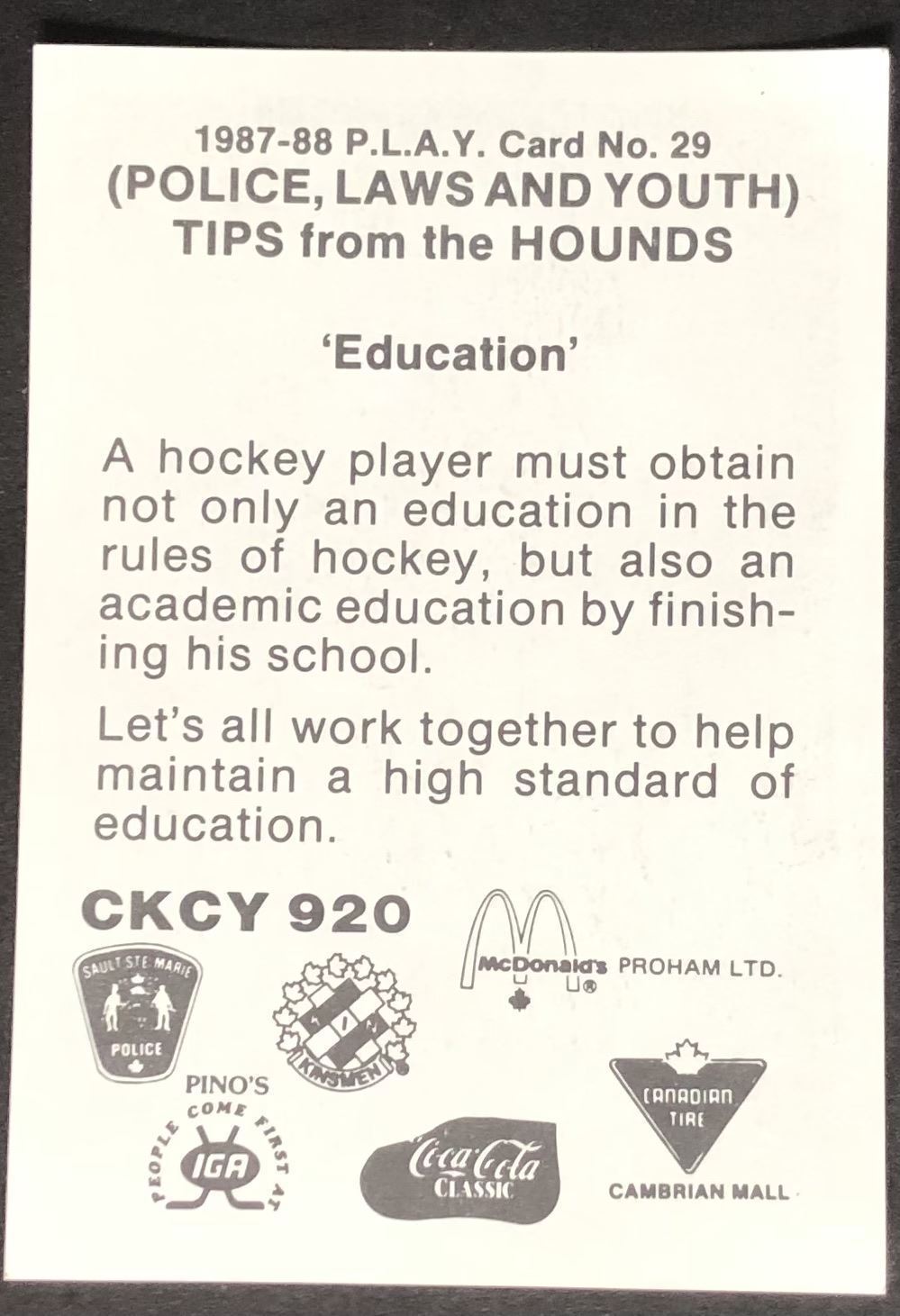 Card #29, Soo Greyhounds set issued by Sault Ste. Marie regional police CHL, OHL, hockey, regional, hall of fame